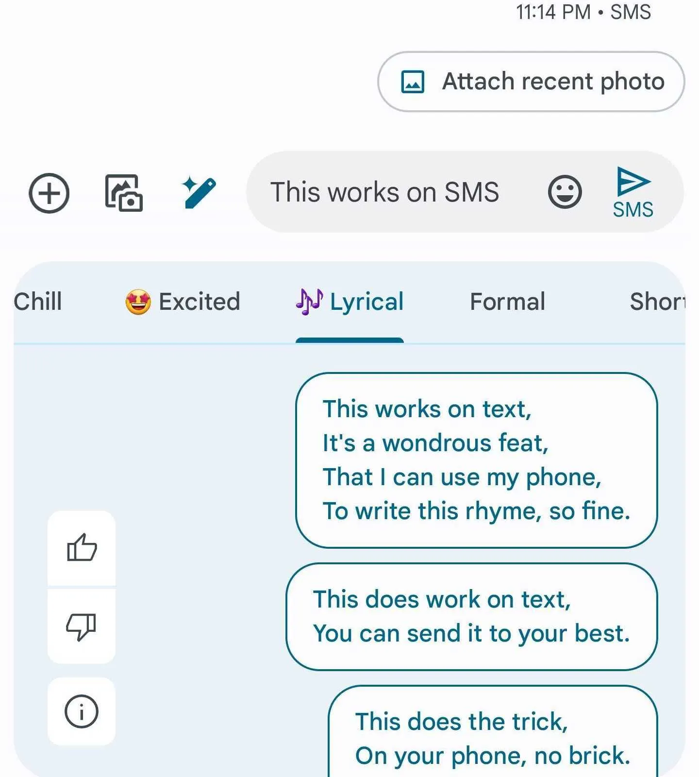 Google Magic Compose è una nuova funzionalità dell’app Messaggi che aiuta a scrivere messaggi più velocemente e facilmente. La funzionalità utilizza l’intelligenza artificiale per suggerire frasi complete basate sulle conversazioni precedenti, e permette di scegliere il tono del messaggio, che sia una frase dal ritmo di una canzone o una frase poetica shakespeariana. Con più opzioni disponibili per ogni stile di risposta, tutto ciò che si deve fare è scorrere, trovare una risposta adatta e premere Invia.