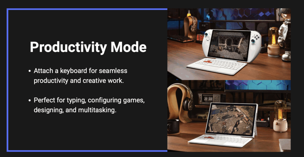 Il dispositivo non si limita al gaming: i contenuti multimediali possono essere convertiti anch’essi in 3D. Film in streaming, clip personali o foto diventano immediatamente immersivi, con il limite dichiarato di non supportare immagini specchiate. A completare il pacchetto ci sono i controller staccabili con touch panel integrato, il kickstand posteriore per modalità da tavolo e il supporto a diversi scenari d’uso, passando dal formato portatile a quello “tablet” o persino “laptop-style” con tastiera collegata.