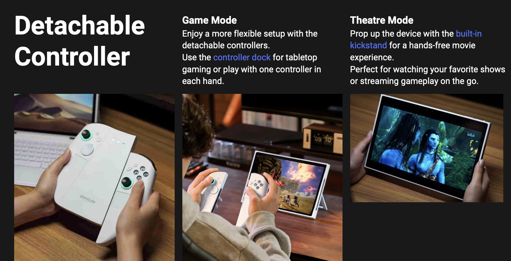 Il dispositivo non si limita al gaming: i contenuti multimediali possono essere convertiti anch’essi in 3D. Film in streaming, clip personali o foto diventano immediatamente immersivi, con il limite dichiarato di non supportare immagini specchiate. A completare il pacchetto ci sono i controller staccabili con touch panel integrato, il kickstand posteriore per modalità da tavolo e il supporto a diversi scenari d’uso, passando dal formato portatile a quello “tablet” o persino “laptop-style” con tastiera collegata.