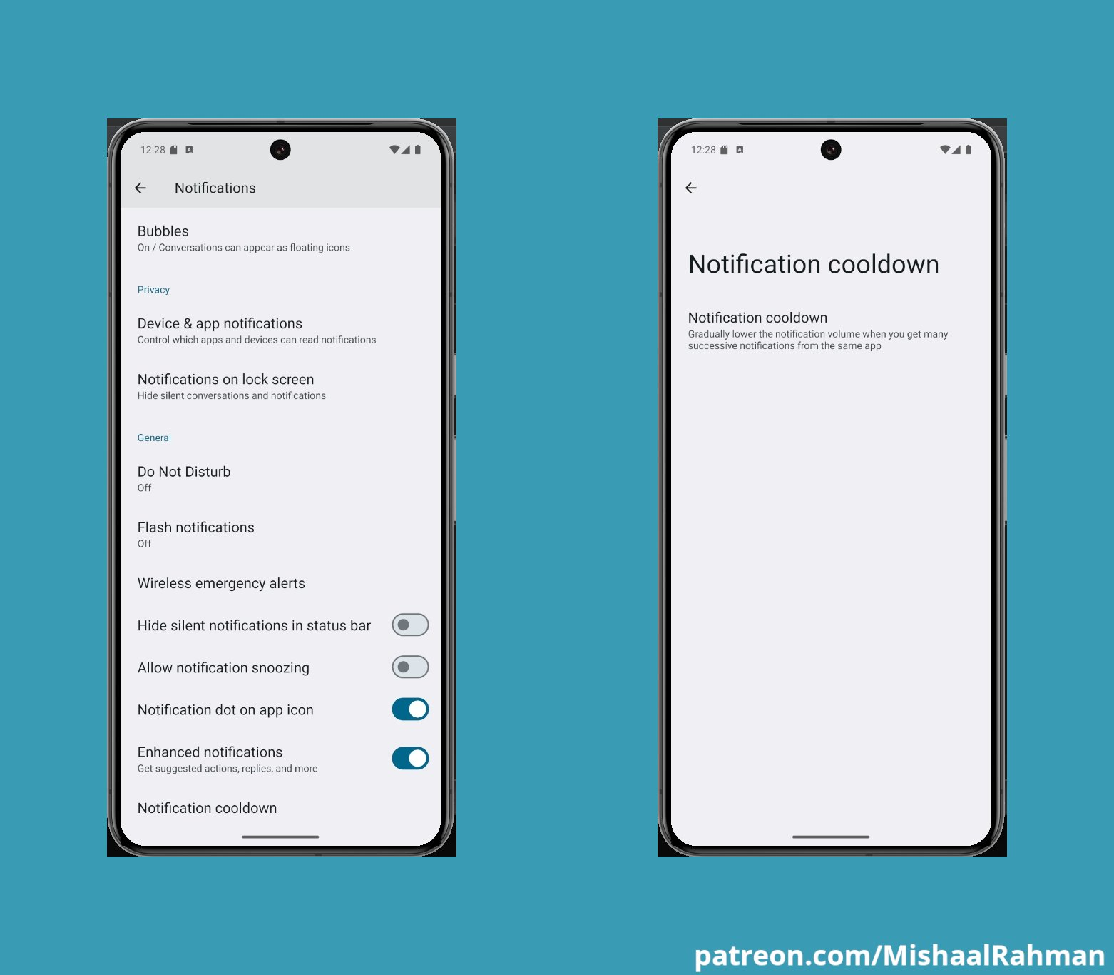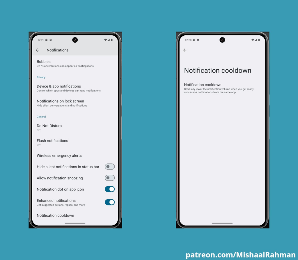 Nella developer preview, era stata inserita una opzione per cambiare il cooldown delle notifiche, ora rimossa.