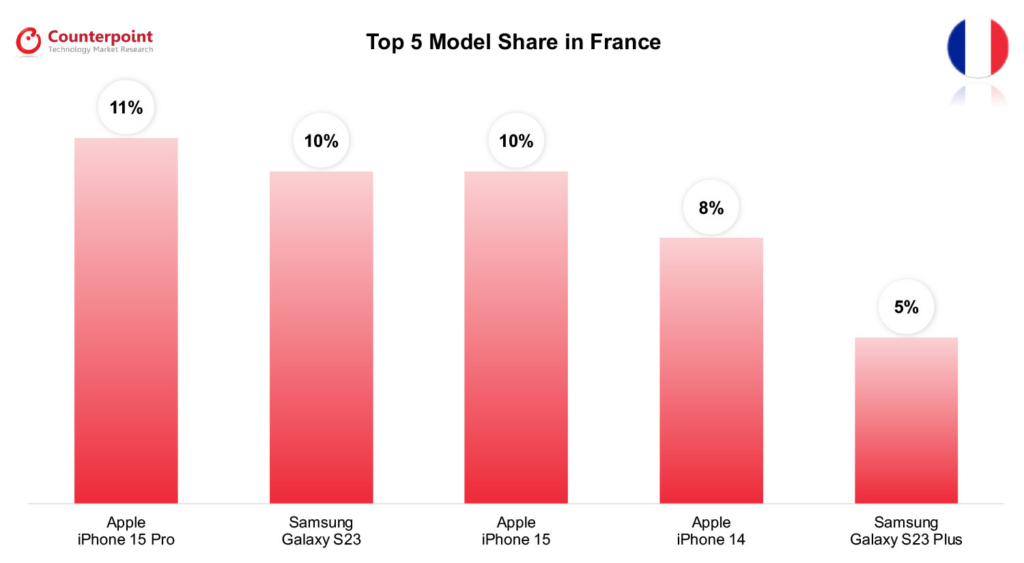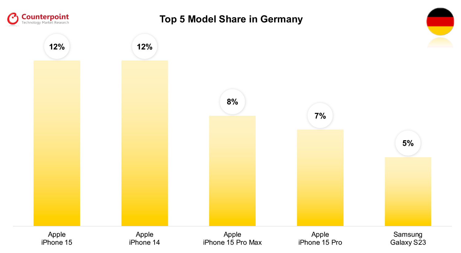 In particolare, negli Stati Uniti, Apple ha ottenuto quattro delle prime cinque posizioni in termini di vendite nel mese di ottobre 2023. Il primo posto è stato conquistato dall’iPhone 15 Pro Max, che ha ottenuto il 24% di quota di mercato, seguito dall’iPhone 15 Pro con il 16%, dall’iPhone 15 con il 13%, dall’iPhone 14 con il 4% e, sorprendentemente, dal Galaxy A14 5G di Samsung al quinto posto con il 3%.