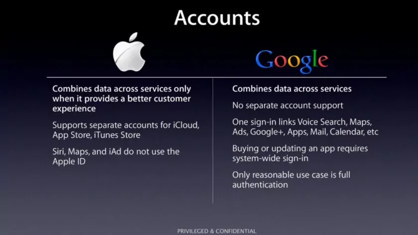 In un’altra slide, Apple spiega come il suo approccio alla privacy sia migliore rispetto a quello di Google. La società afferma che combina i dati tra diversi servizi solo quando ciò comporta una migliore esperienza per il cliente, mentre Google combina i dati attraverso tutti i suoi servizi. Altri esempi includono il fatto che la ricerca vocale di Google sia collegata all’account Google dell’utente, mentre i dati utente di Siri sono collegati solo all’assistente digitale.