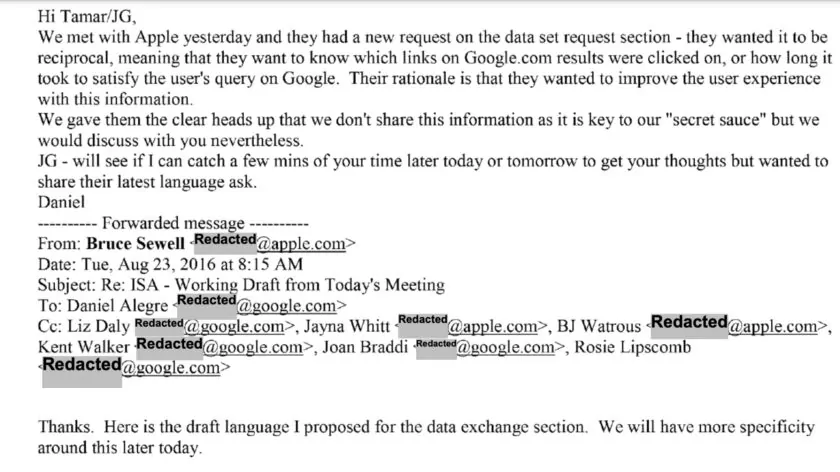 Ironia della sorte, nonostante Apple abbia descritto Android come un enorme dispositivo di tracciamento, una email interna di Google del 2016 riguardante l’accordo tra Apple e Google mostra come Apple desiderasse che la condivisione dei dati con Google fosse reciproca. Nell’email, l’esecutivo di Google nota che è stato risposto ad Apple che Google non condivide informazioni su ciò che gli utenti cliccano in Google Search. Tuttavia, una risposta a quell’email include una proposta di scambio di dati redatta, sollevando domande su quali dati utente Google potrebbe condividere con Apple.