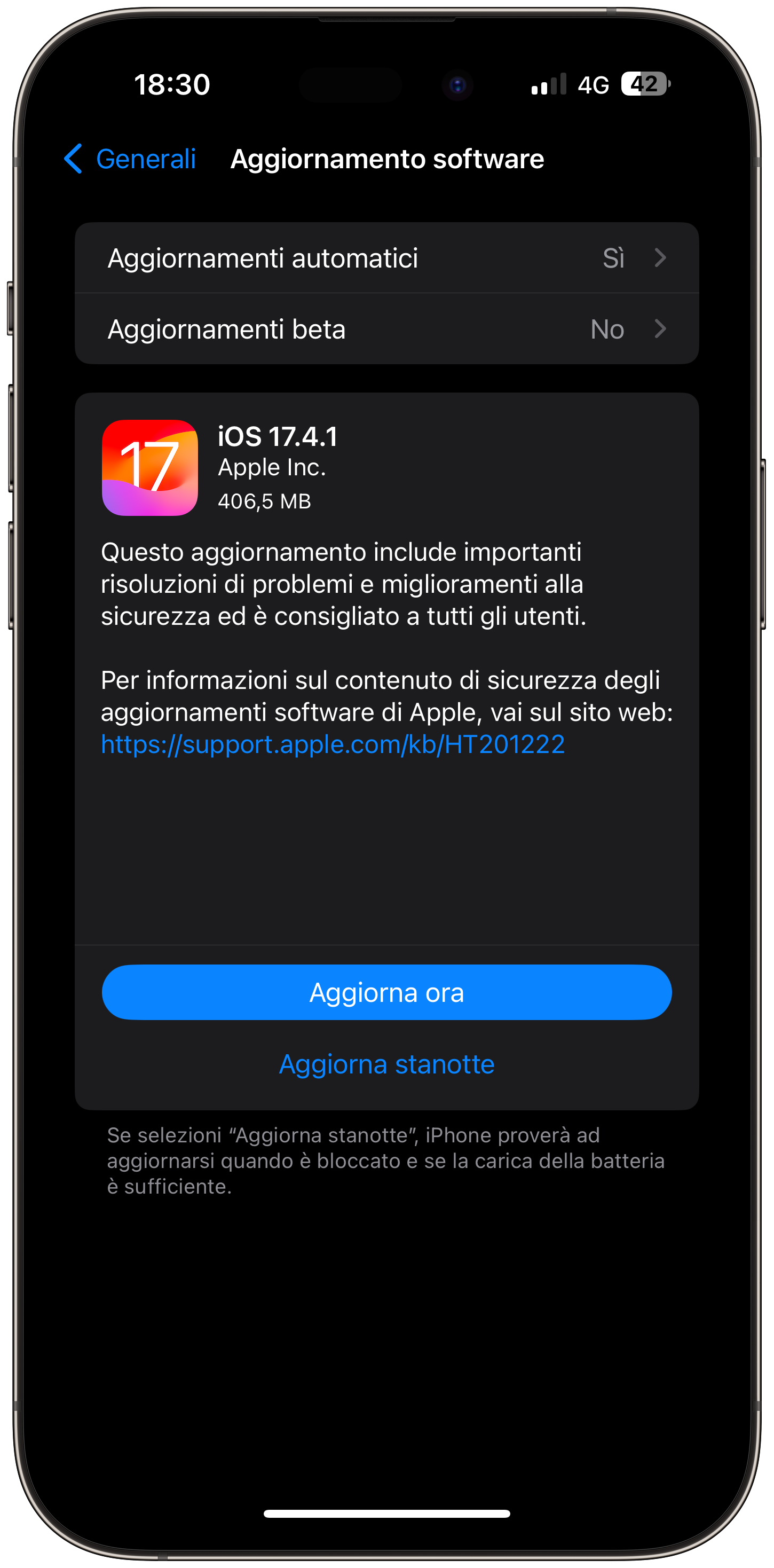 Dopo l’anticipazione di qualche giorno fa, vi confermiamo che Apple ha appena rilasciato iOS 17.4.1. Si tratta di una versione minore, di un aggiornamento che porta quindi solo bug fix e miglioramenti alla sicurezza dei dispositivi.