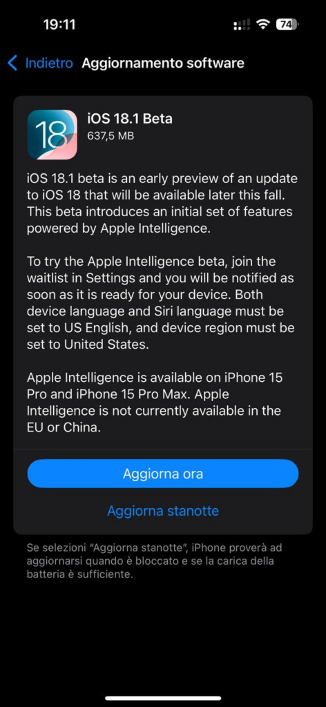 Siamo già in fase di installazione sui nostri dispositivi, ma non ci aspettiamo grandi novità: Apple Intelligence, infatti, non dovrebbe essere disponibile nel nostro paese, quindi per noi le novità saranno poche o nulle.