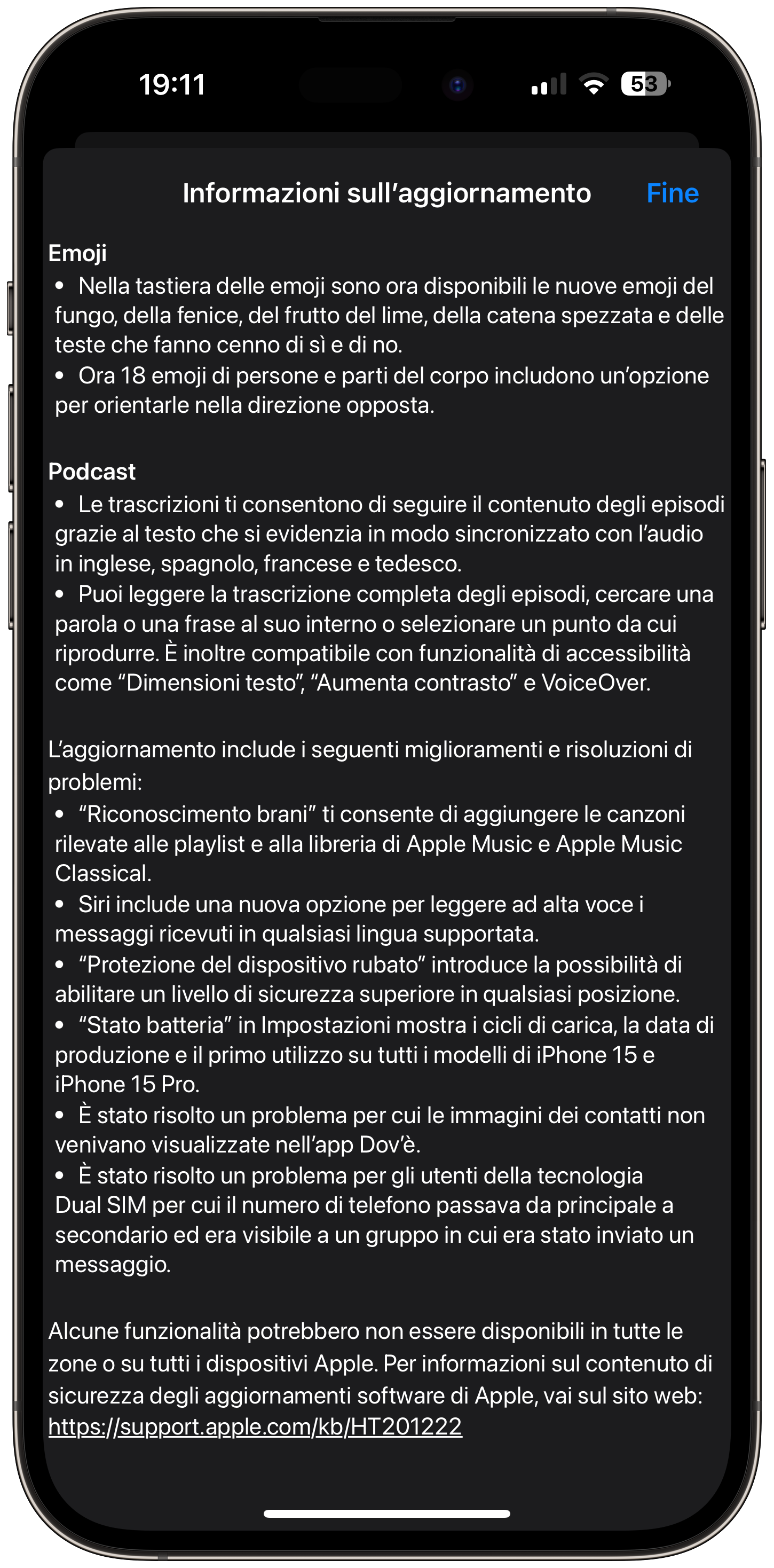 Tra le altre voci importanti troviamo anche nuove 18 nuove emoji, trascrizioni nei podcast, tanti bug fix, miglioramenti a Siri, e l’atteso potenziamento della protezione del dispositivo rubato.