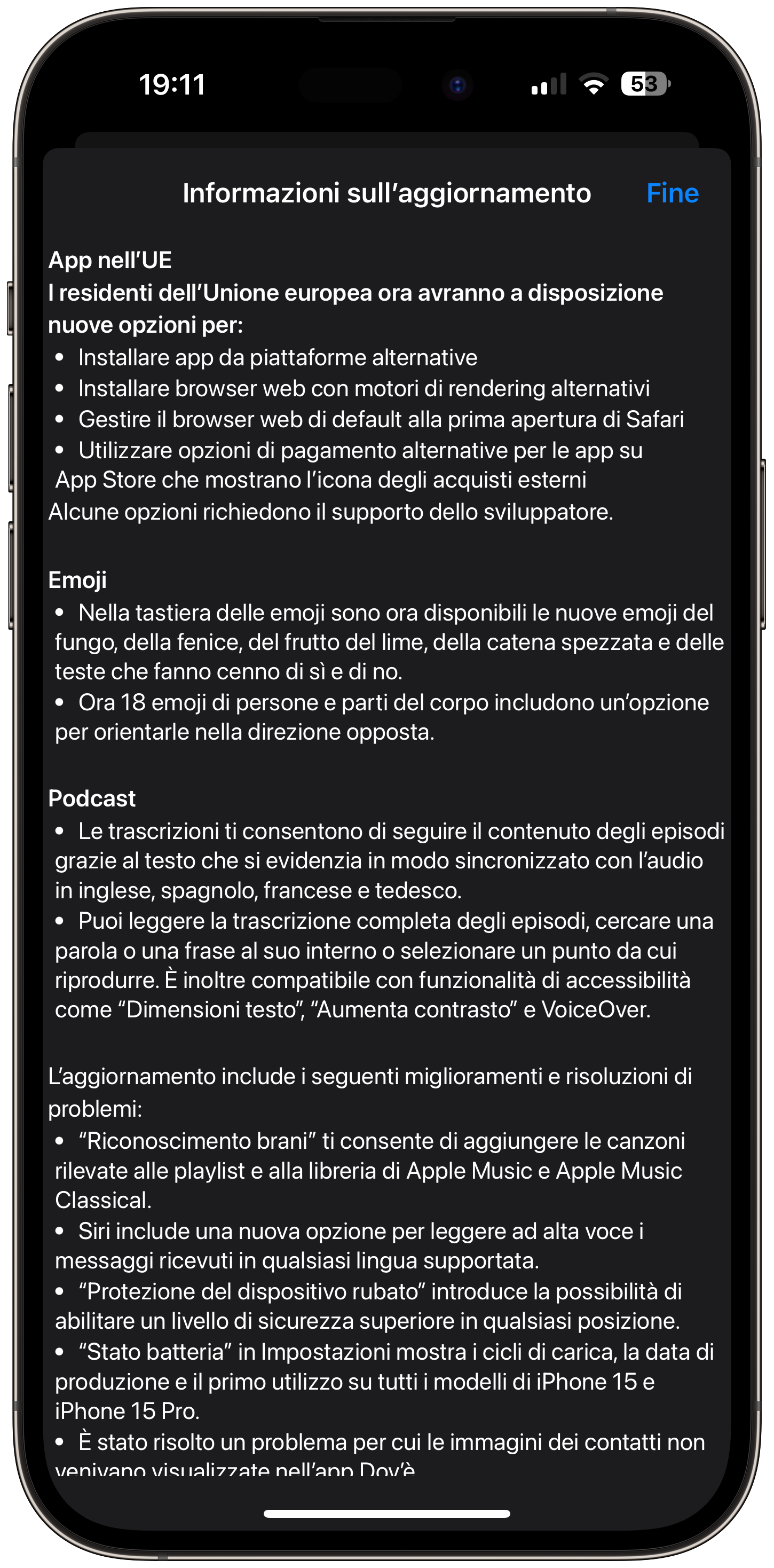 Il changelog è in tutta onestà bello denso di novità , anche se è impossibile ignorare la più grande, ossia quella voce “App nell’UE”.