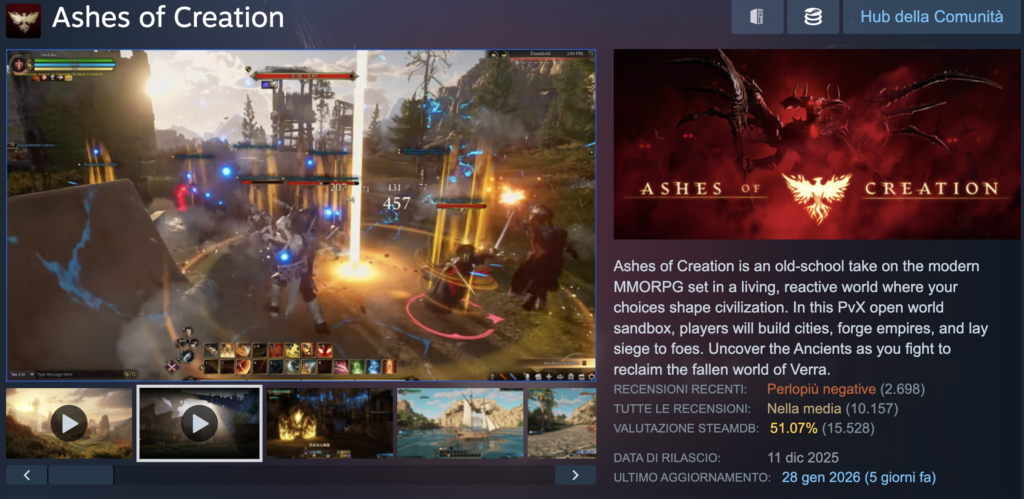 Tutto è cambiato drasticamente alla fine del 2025. Con una mossa a sorpresa che ha contraddetto anni di dichiarazioni (“Non andremo su Steam in Early Access per non svalutare il prodotto”), Intrepid Studios ha lanciato Ashes of Creation sulla piattaforma di Valve.