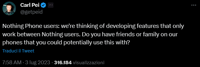 Stando ad un tweet di Carl Pei, l’azienda avrebbe intenzione di creare delle specifiche features che funzionano solo tra Nothing Phone 1 e 2, un po’ come accade ad esempio su iPhone. La cosa suona abbastanza strana, contando il fatto che Nothing OS si basa su Android, quindi sarebbe quantomeno assurdo introdurre funzionalità per le quali il sistema operativo principale verrebbe escluso.