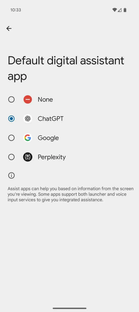 La versione beta di ChatGPT (1.2025.070) include l’opzione per impostare l’IA come assistente predefinito nelle impostazioni di Android. Attualmente, la funzionalità è ancora in fase beta e presenta alcune limitazioni rispetto a Gemini o Perplexity.
