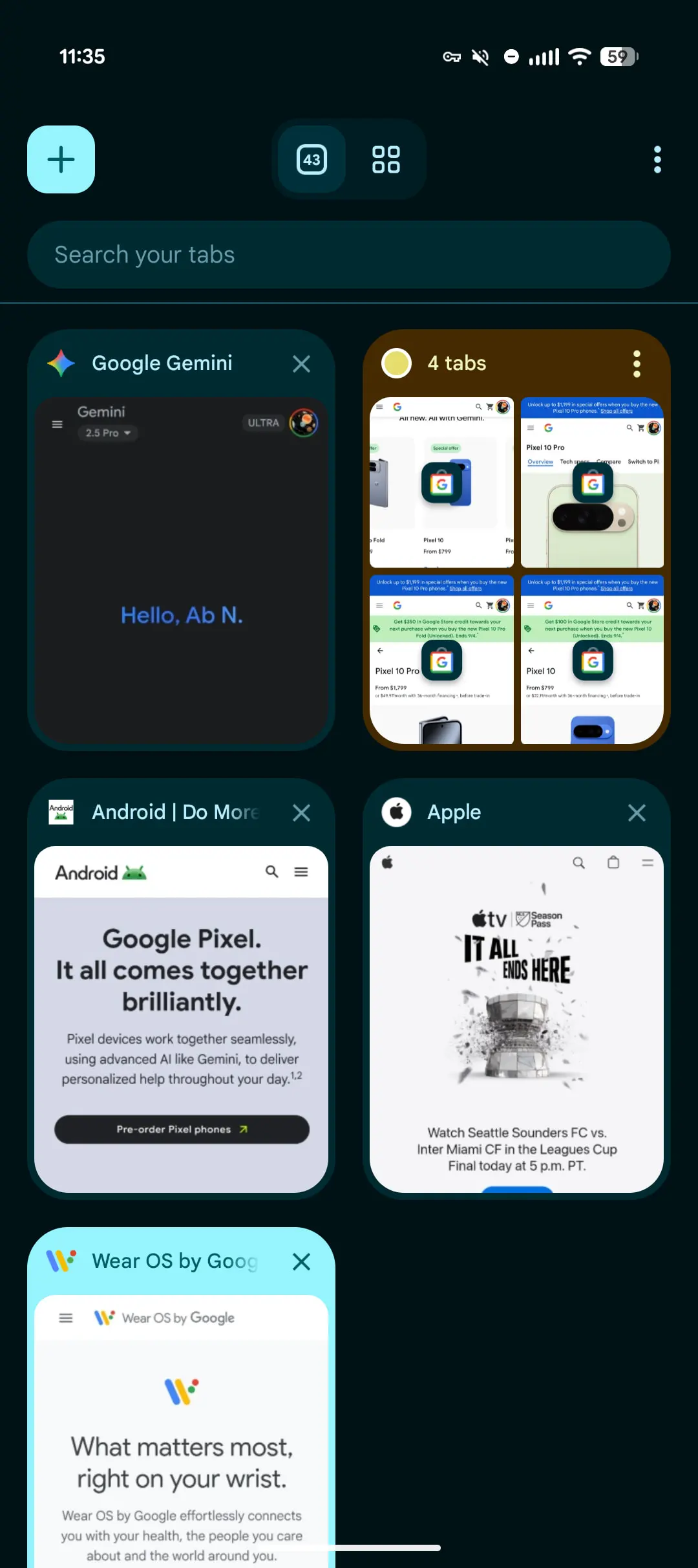 Anche la gestione delle schede si rinnova: il tasto per aprirne una nuova è ora inserito in un riquadro arrotondato con sfondo dinamico, mentre le Tab Group assumono il colore scelto dal tema per rendere più immediata la distinzione tra diversi gruppi. Persino la barra degli indirizzi inizia a integrare elementi “expressive”, come un indicatore di caricamento segmentato e arrotondato. Pur con questi ritocchi visivi, Google non ha aumentato le dimensioni degli elementi, mantenendo la compattezza tipica di Chrome.