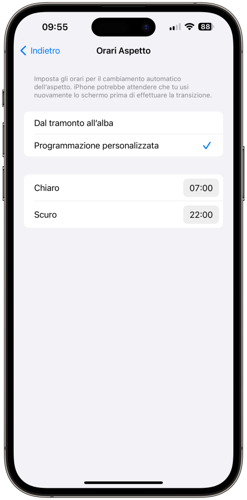 Per questo motivo, la dark mode è un must da attivare, sia programmandola, sia impostandola a tempo indererminato.
