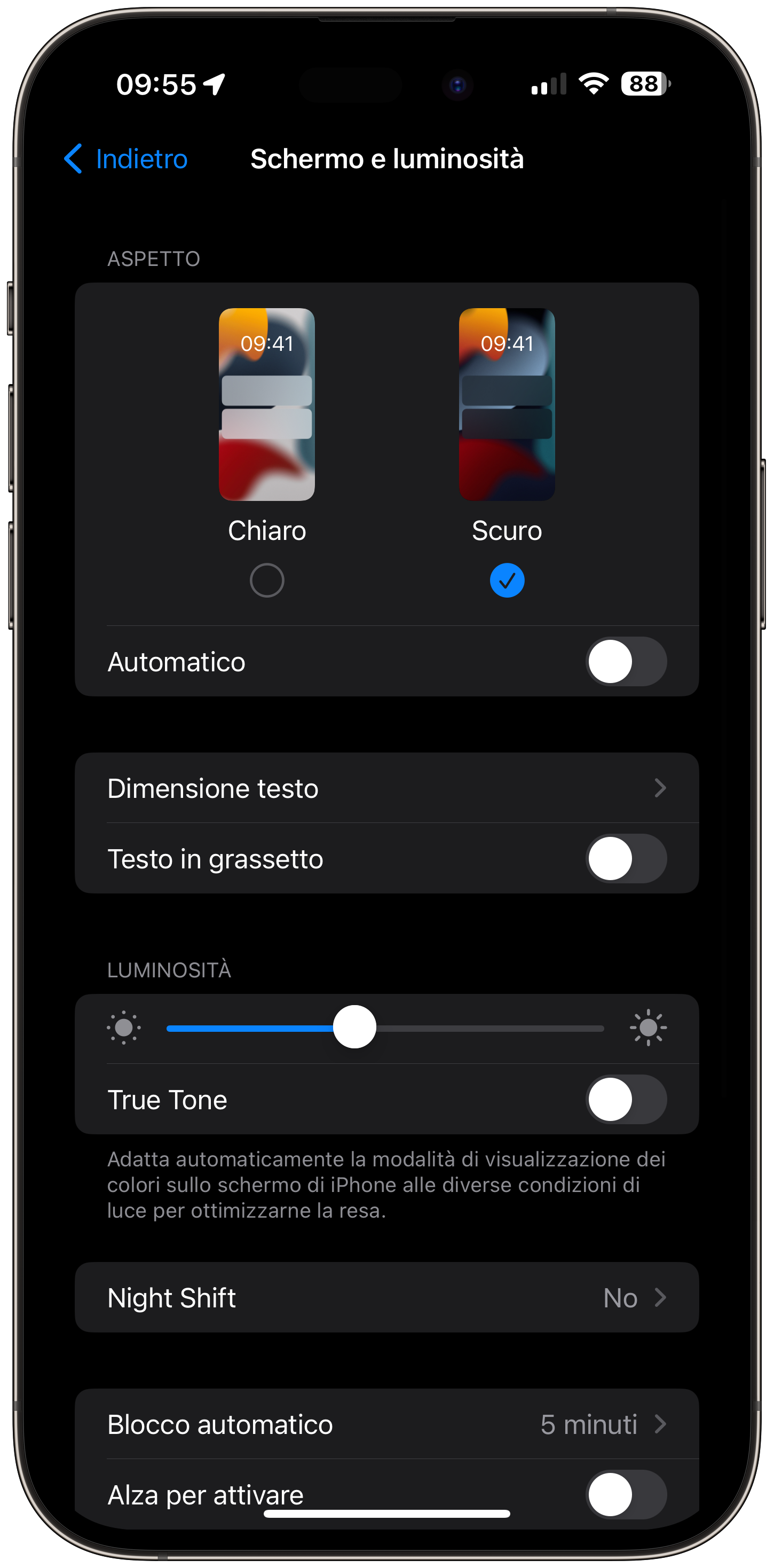Partiamo dalla nostra ormai amica app “Impostazioni”, e dirigiamoci su “Schermo e LuminositĂ ”.