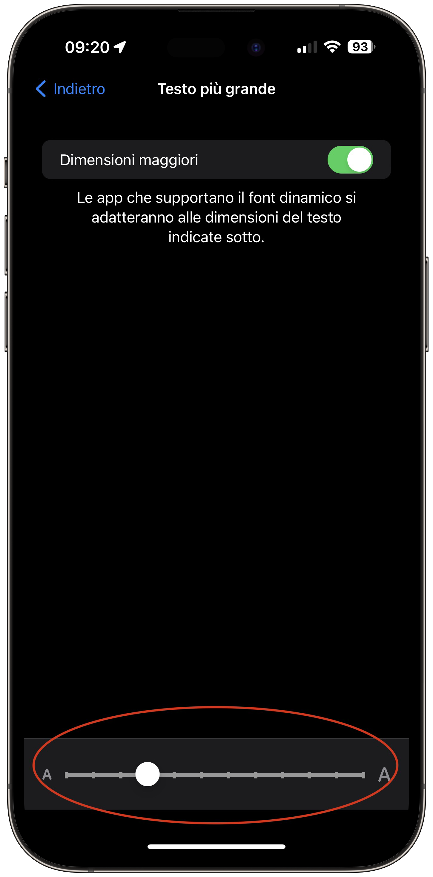 A questo punto ci troveremo di fronte ad una schermata tanto essenziale quanto pratica. In basso possiamo utilizzare un comodo slider per scegliere la dimensione che più ci aggrada del testo, aumentandola, o addirittura diminuendola.
