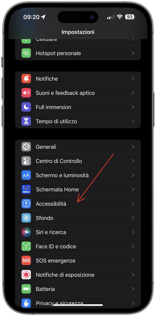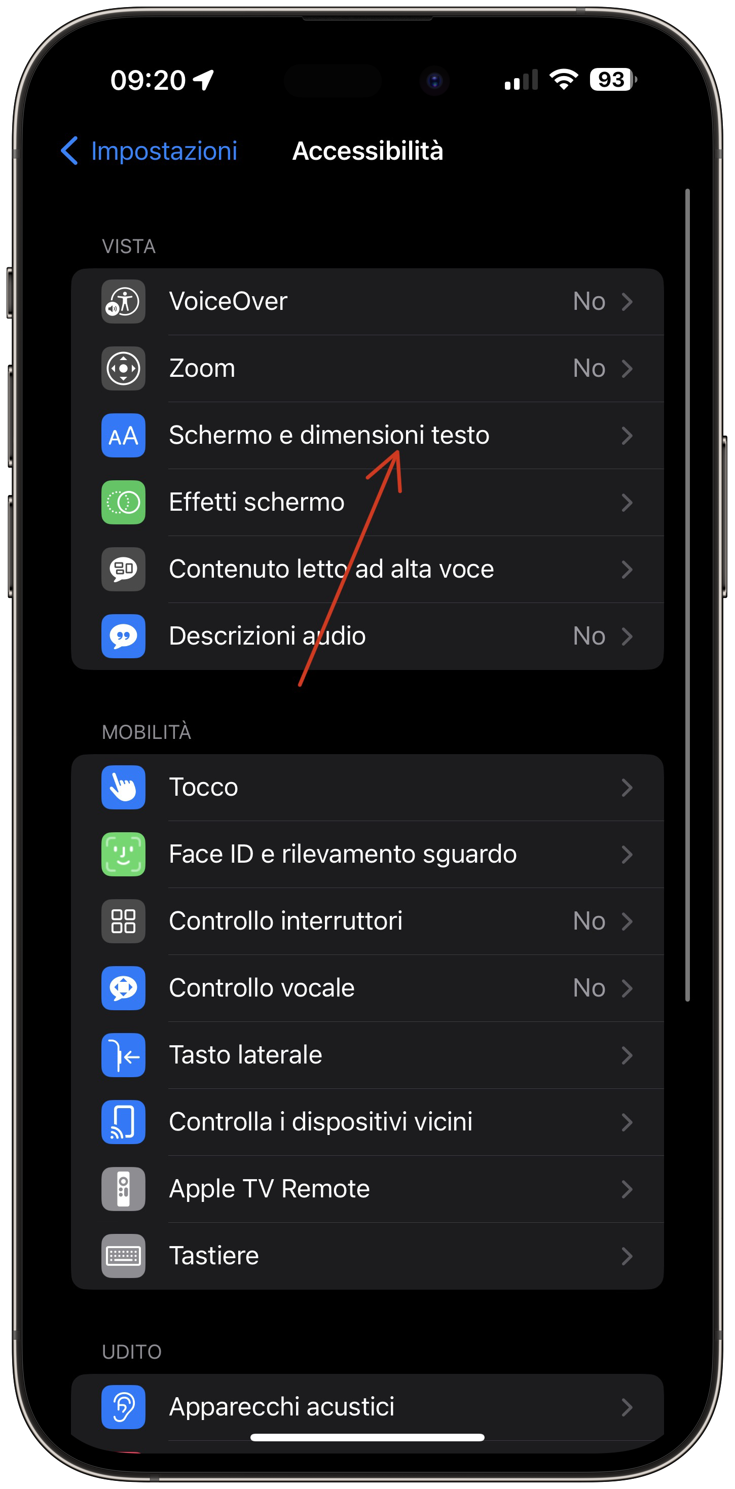 Iniziamo aprendo l’app “Impostazioni” e scorrendo fino ad aprire “Accessibilità ”, dopodiché andiamo su “Schermo e dimensioni testo”.