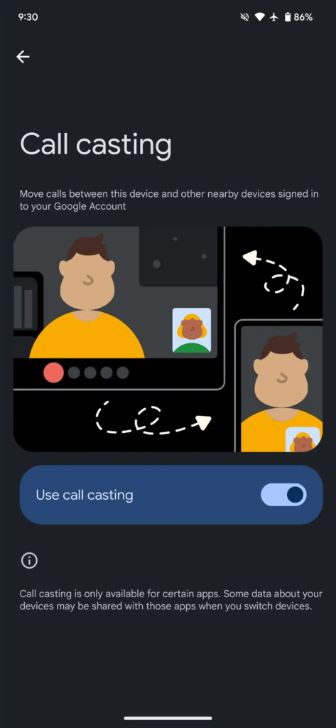 Call Casting – Disponibile per alcune applicazioni, tra cui Google Meet, permette di spostare una chiamata in corso da un dispositivo all’altro, senza interromperla, che sia un chromebook, un tablet o uno smartphone.