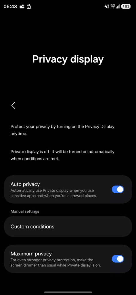 La funzione sarà personalizzabile: con Auto Privacy si attiverà automaticamente in situazioni considerate a rischio, come l’uso di app sensibili o in ambienti affollati, mentre con Custom Conditions sarà possibile definire scenari precisi.
