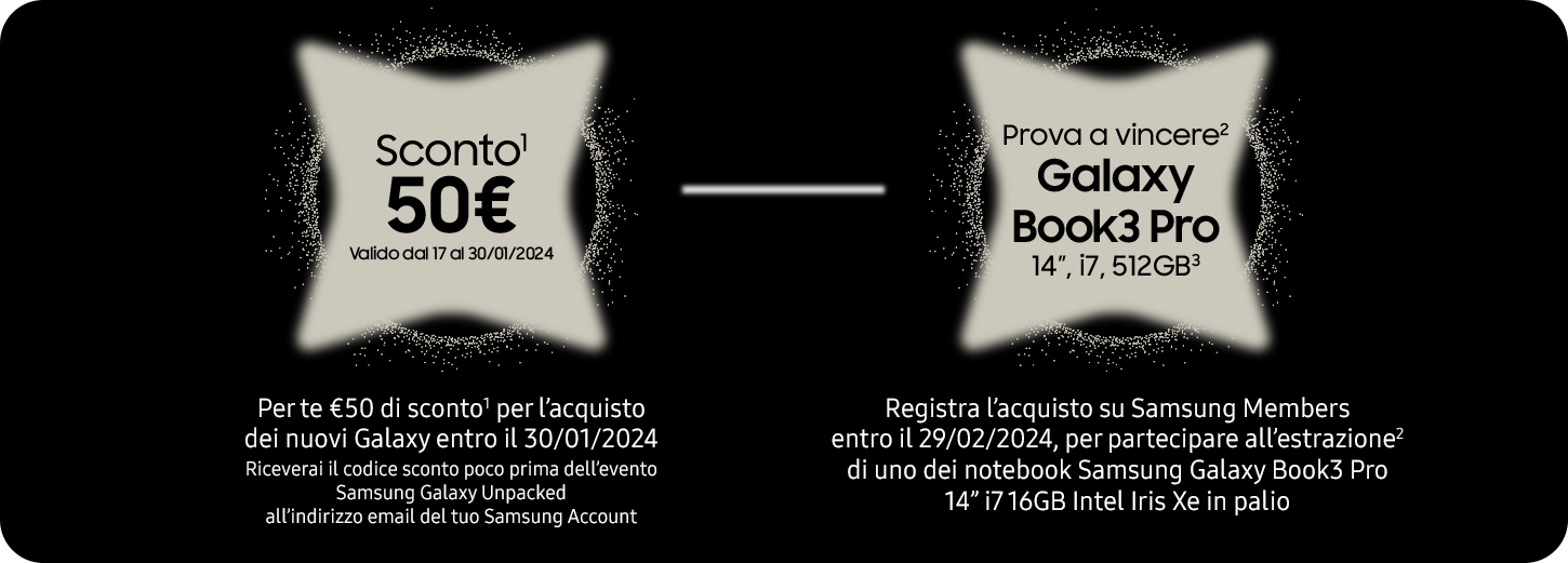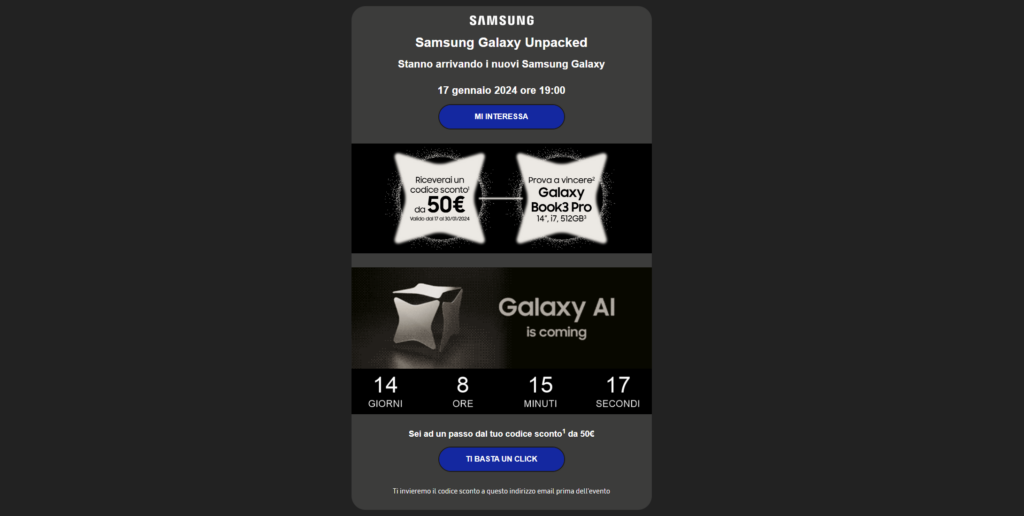 Samsung ha inviato nelle scorse ore una email ufficiale agli iscritti della loro NewsLetter invitando a seguire l’evento in diretta streaming il 17 gennaio 2024 alle ore 19:00. Chi si preregistrerà avrà la possibilità di avere uno sconto di 50 euro sull’acquisto del nuovo dispositivo, e la possibilità di essere estratto per vincere un Galaxy Book 3 Pro registrando poi il prodotto acquistato sul sito dedicato Samsung Promo.