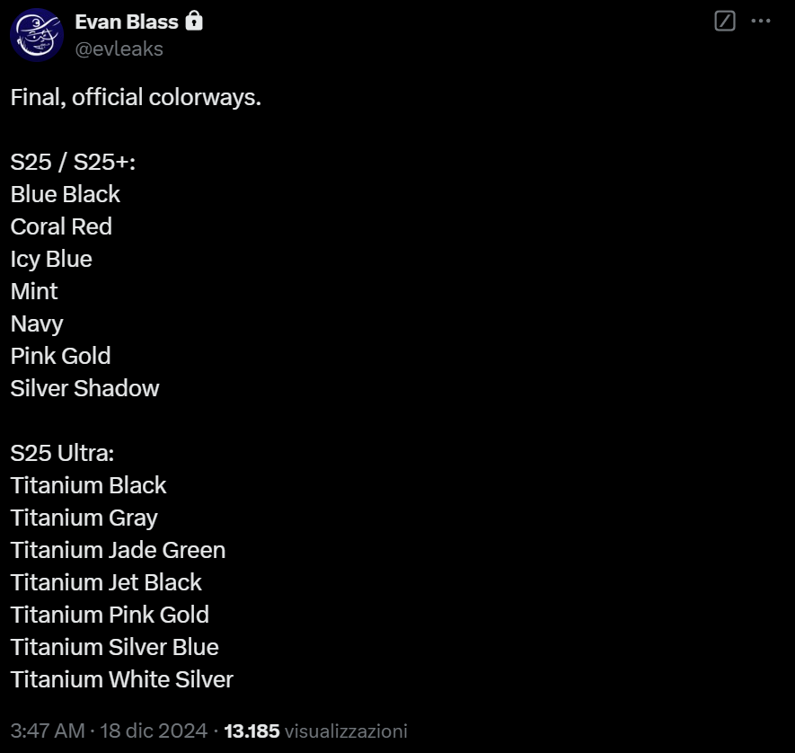 Samsung si prepara al lancio della serie Galaxy S25, previsto per il prossimo mese, ma nel frattempo Evleaks ci svela le colorazioni ufficiali dei nuovi smartphone. Galaxy S25 e S25+ saranno disponibili in sette varianti di colore: Blue Black, Coral Red, Icy Blue, Mint, Navy, Pink Gold e Silver Shadow.