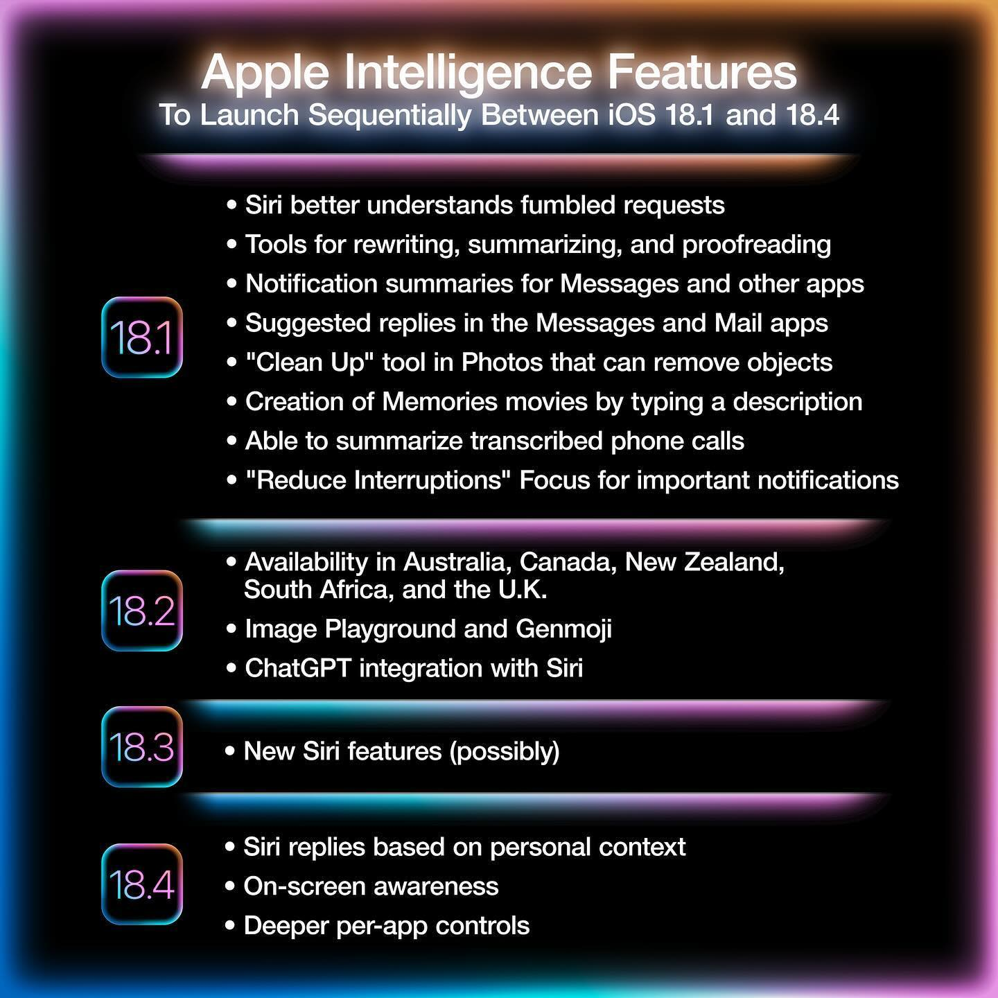 Apple introdurrà infatti nuove funzionalità di Apple Intelligence spalmandole su vari aggiornamenti, come iOS 18.2 ecc, quindi, per fare un po’ di chiarezza in più, ci siamo basati su questo articolo che ipotizza una potenziale roadmap.