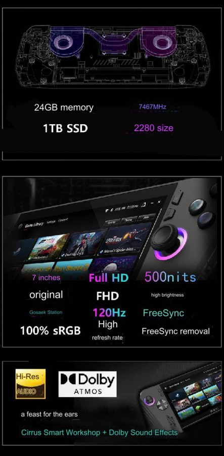 ROG Ally X manterrà lo stesso design di base della ROG Ally ma sarà disponibile in nero. Le specifiche confermano un touchscreen da 7 pollici con risoluzione FHD, una frequenza di aggiornamento di 120Hz e una luminosità di picco di 500 nits. Resta da vedere se il pannello sarà ancora LCD o se Asus passerà a OLED. In ogni caso, supporterà AMD FreeSync e Dolby Atmos.
