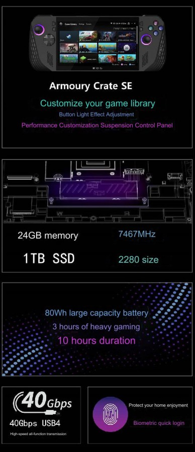 Il dispositivo sarà alimentato dal processore AMD Ryzen Z1 Extreme, lo stesso a 4nm con 8 core e 16 thread della precedente ROG Ally, abbinato a grafica RDNA3, 24GB di RAM e un SSD PCIe 4.0 da 1TB nel formato M.2 2280. Asus offrirà l’interfaccia Armoury Crate SE, ma l’elemento più importante è la nuova batteria da 80Wh, che dovrebbe offrire un’autonomia migliorata di molto rispetto alla cella da 40Wh del primo modello, con una durata fino a 3 ore di “gioco intenso”.