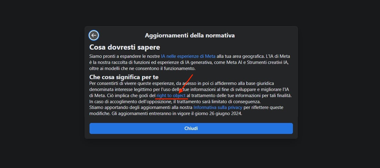 - Cliccate sulla notifica, e vi si aprirà un disclaimer che vi spiegherà quali sono le intenzioni di Meta, in maniera abbastanza fumosa, se possiamo aggiungerlo, con l’unica possibilità di azione insita in un unico pulsante con scritto “chiudi”. Voi, invece, sceglierete la scritta “right to object“. Bella nascosta, eh?