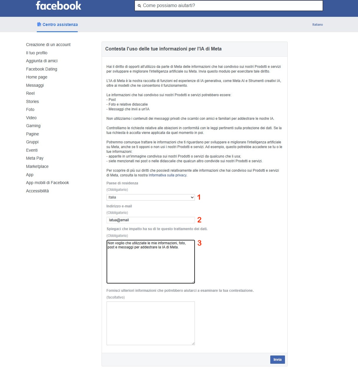 - Armiamoci di pazienza ed inseriamo il nostro paese nel campo 1, l’email con la quale ci siamo iscritti a facebook nel campo 2 ed una motivazione per la quale rifiutiamo la funzione nel campo 3. Se non vi viene in mente nulla, potete utilizzare la nostra di esempio: