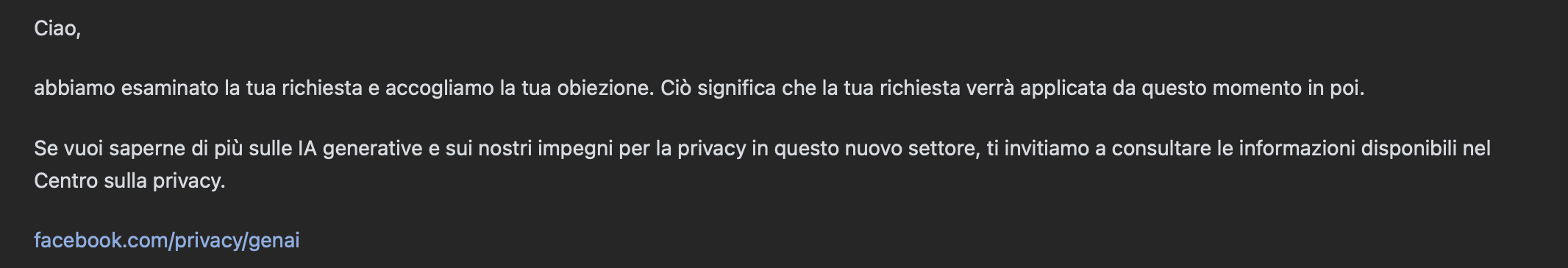 “Non voglio che utilizziate le mie informazioni, foto, post e messaggi per addestrare la IA di Meta”.