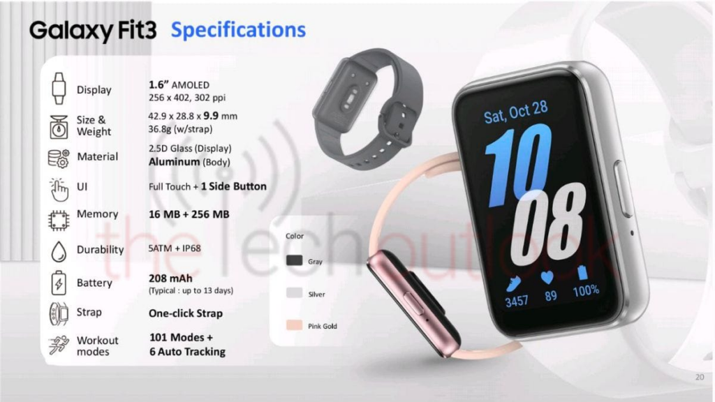 Il Galaxy Fit 3 vanterà uno schermo AMOLED da 1,6 pollici con risoluzione di 256 x 402 pixel e densità di 302 ppi, corpo in alluminio, vetro curvo 2.5D, certificazione IP68 per resistenza ad acqua e polvere, oltre a un display completamente touch ed un pulsante laterale.