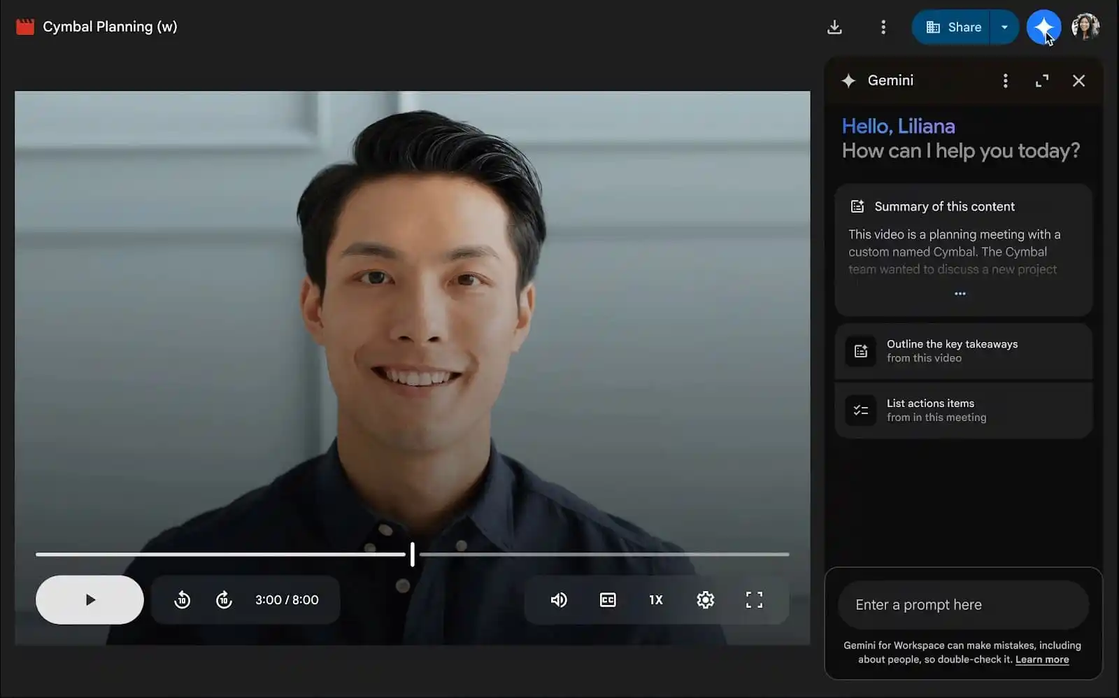 Google sta apportando un’importante novità nel pannello laterale di Gemini su Google Drive: sarà infatti possibile ottenere riassunti e fare domande sul contenuto di un video direttamente dal player web. Dopo aver aperto un video presente su Drive, infatti, basterà cliccare sull’icona di Gemini in alto a destra per visualizzare un riepilogo automatico, suggerimenti per elencare i punti chiave o individuare azioni da svolgere.