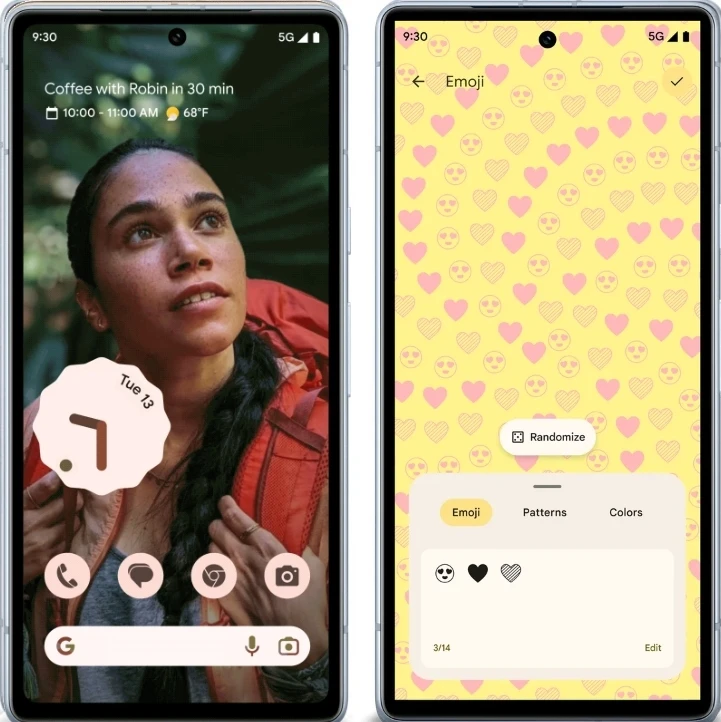 Come annunciato al Google I/O, dal Pixel 6 in poi si potrà impostare un wallpaper completamente custom composto dalle vostre emoji preferite, oltre agli sfondi cinematici, ossia foto 2D che vengono trasformate in 3D grazie all’aiuto dell’AI.
