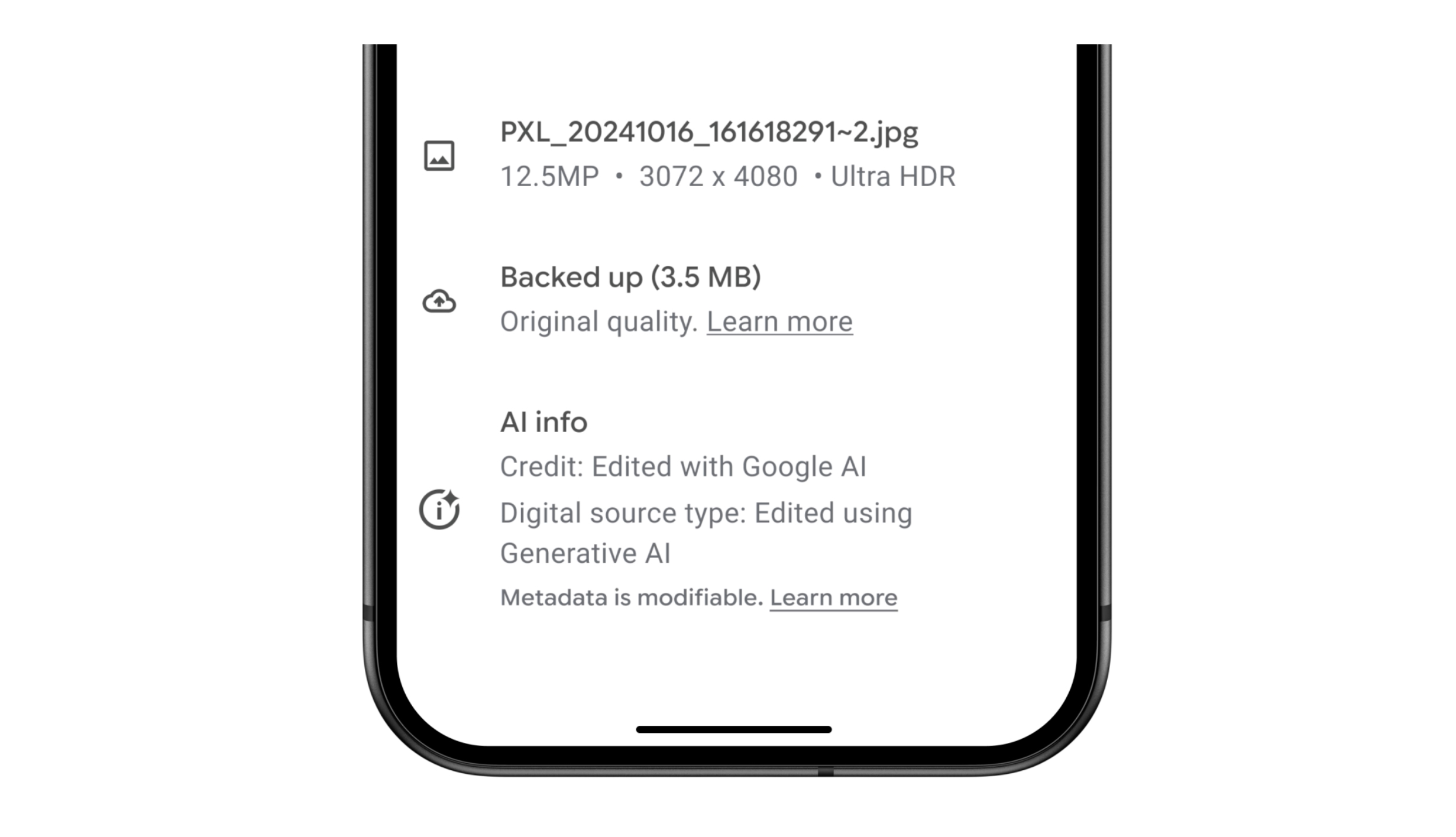 Per garantire la massima trasparenza sull’utilizzo di queste tecnologie, Google Foto indicherà chiaramente quando un’immagine è stata modificata tramite questi tool. A partire dalla prossima settimana, l’app Foto mostrerà infatti questa informazione accanto ai dettagli del file, come nome, posizione e stato del backup.