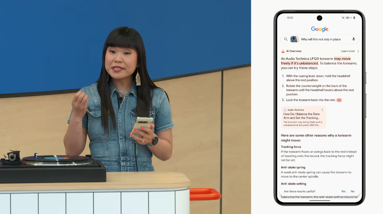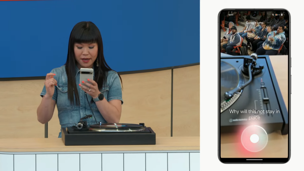 Un’altra dimostrazione molto molto interessante è stata effettuata su Google Lens. Nella demo, viene attivata la fotocamera ed un feed video, e viene chiesto all’IA il perché il giradischi non funziona. Lens riconosce in un attimo sia il modello, sia il problema, e fornice una soluzione.