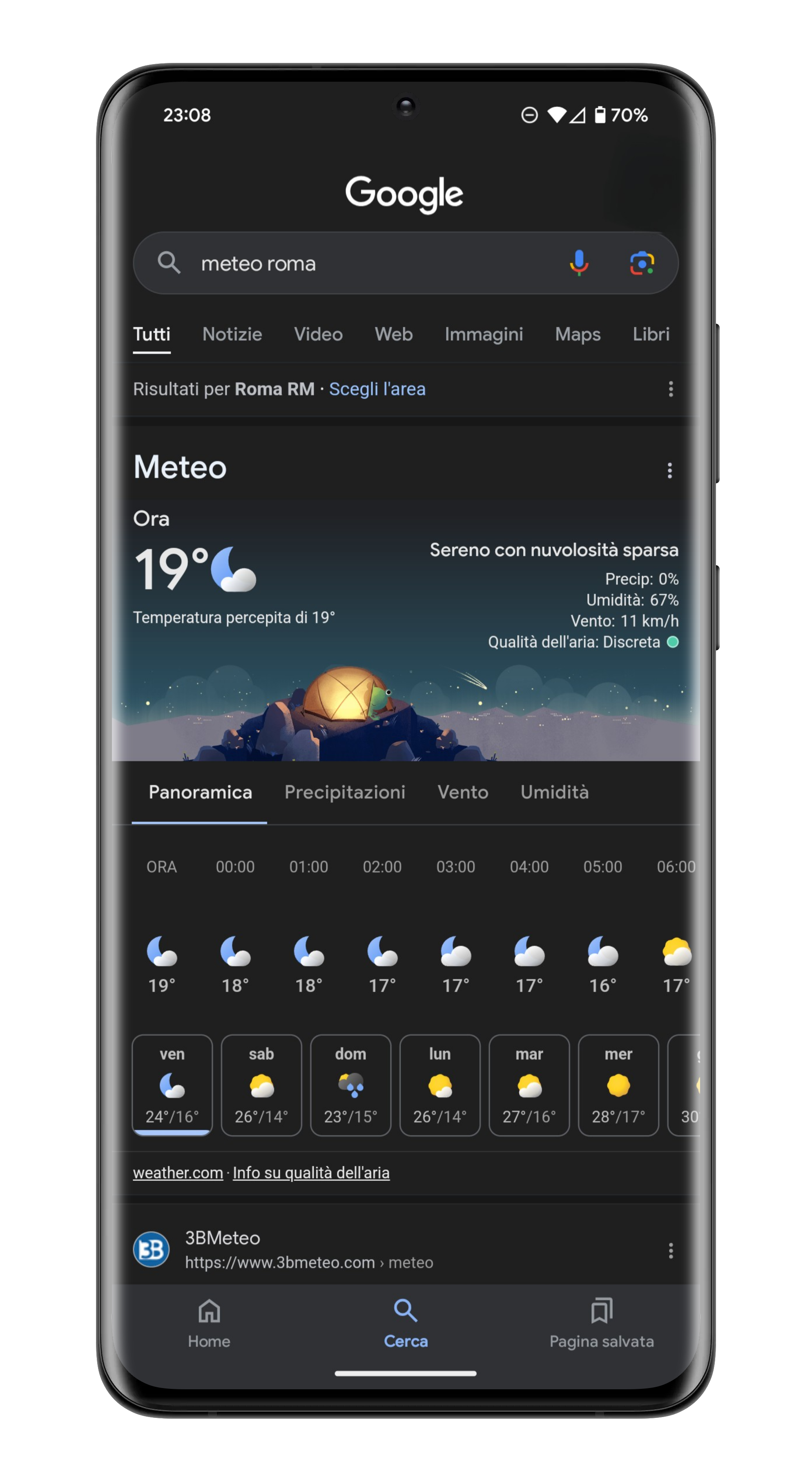 Comunque sia, questa aggiunta è in fase di rollout anche nel meteo integrato in Android, sintomo che a breve verrà probabilmente unificato il tutto, compresa la ricerca su web da desktop, che per ora però manca di questa funzione.
