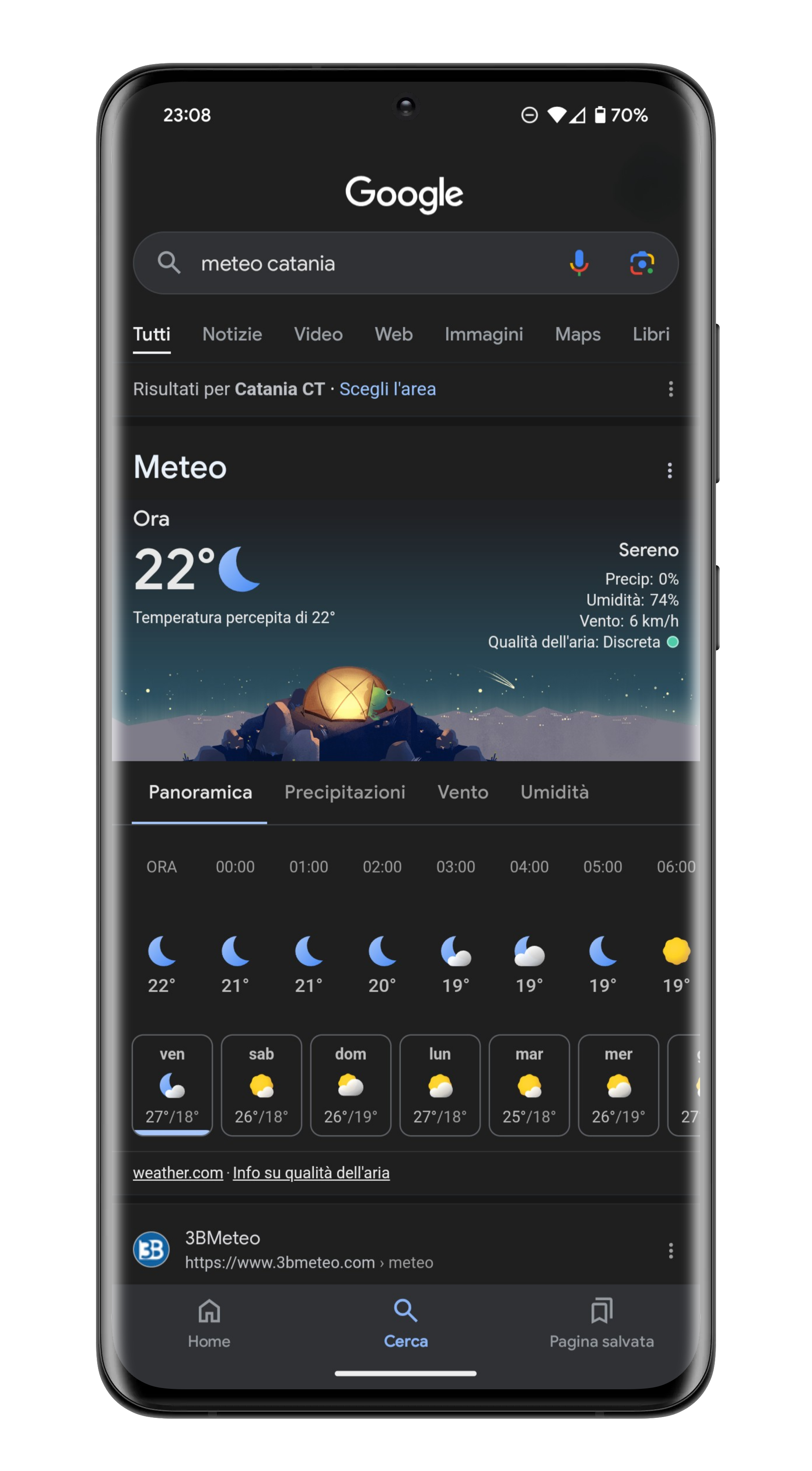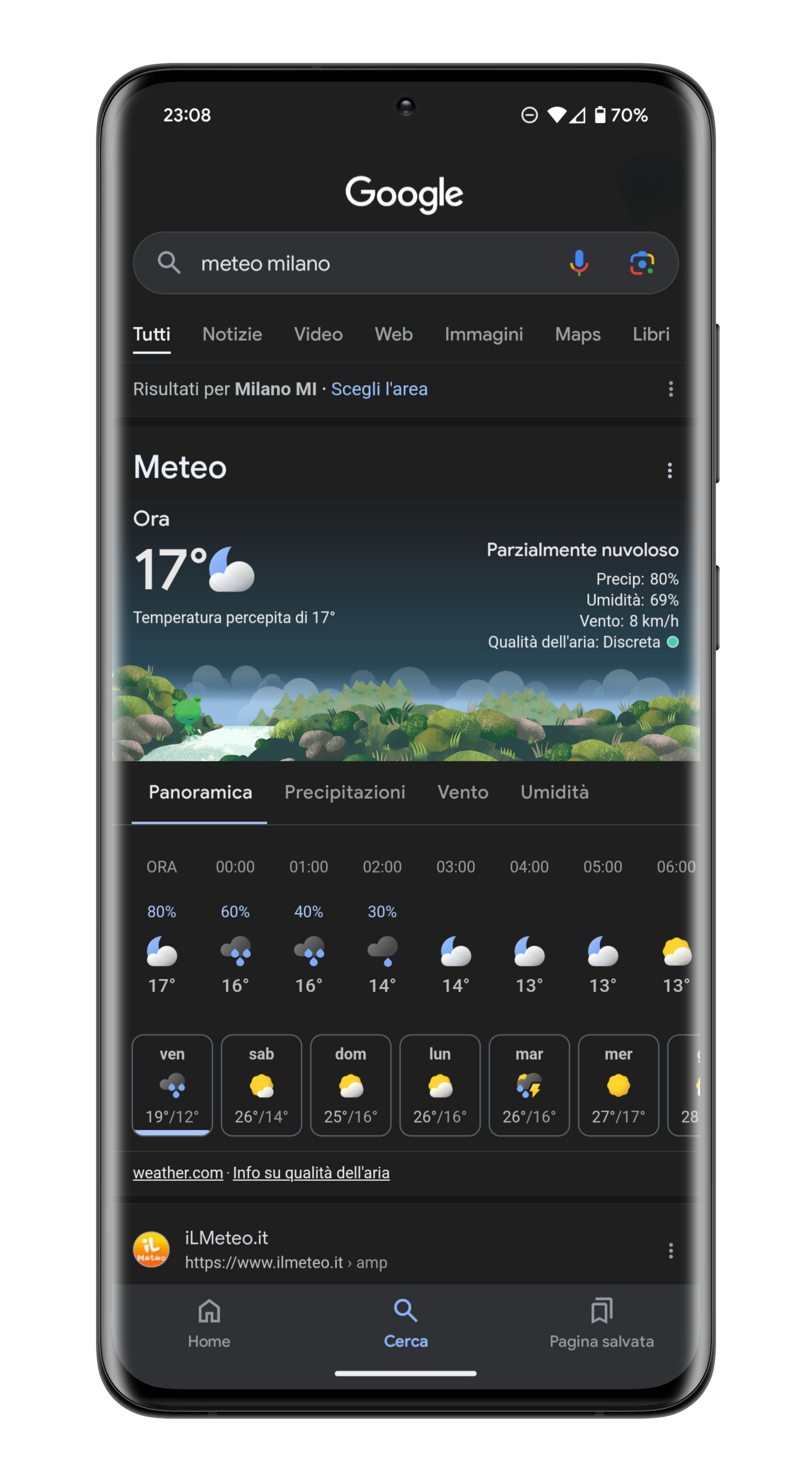 Se la richiesta arriva da mobile, infatti, oltre alle ovvie previsioni del meteo, comparirà un piccolo riquadro riepilogativo che ci mostrerà anche la qualità dell’aria, come possiamo vedere dagli screenshot in basso.