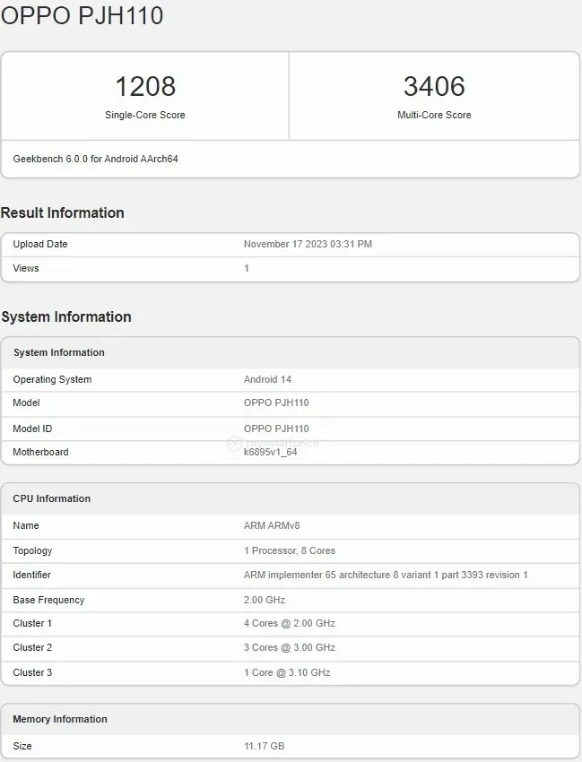 Si avvicina il giorno del lancio ufficiale di OPPO Reno 11, ed una recente apparizione su Geekbench svela alcune delle sue specifiche, incluse prestazioni del processore e quantità di RAM. Il dispositivo, identificato con il numero di modello PJH110, ha raggiunto un punteggio di 1208 nel test single-core e 3406 in quello multi-core. Secondo il test, l’OPPO Reno 11 sarà equipaggiato con sistema operativo Android 14, ed il modello k6895v1_64 di scheda madre insieme alla struttura del processore 1+3+4 core suggerisce l’uso del SOC MediaTek Dimensity 8200. Il modello testato dispone di 12GB di RAM.
