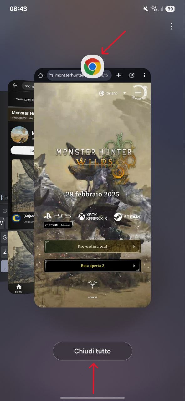 - Anzitutto apriamo il multitasking, operazione molto semplice che si fa con uno scorrimento del dito dal basso verso l’alto partendo dalla barra delle gesture posta nella parte bassa dello schermo e mantenendo il dito sullo stesso per circa un secondo.
