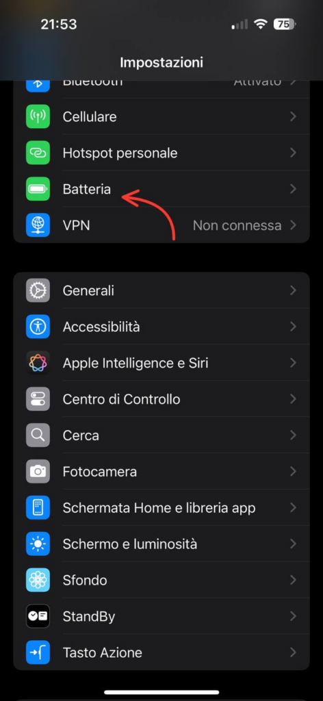 Posizioniamoci sulla voce Batteria nell’app Impostazioni, dopodiché scegliamo In carica.