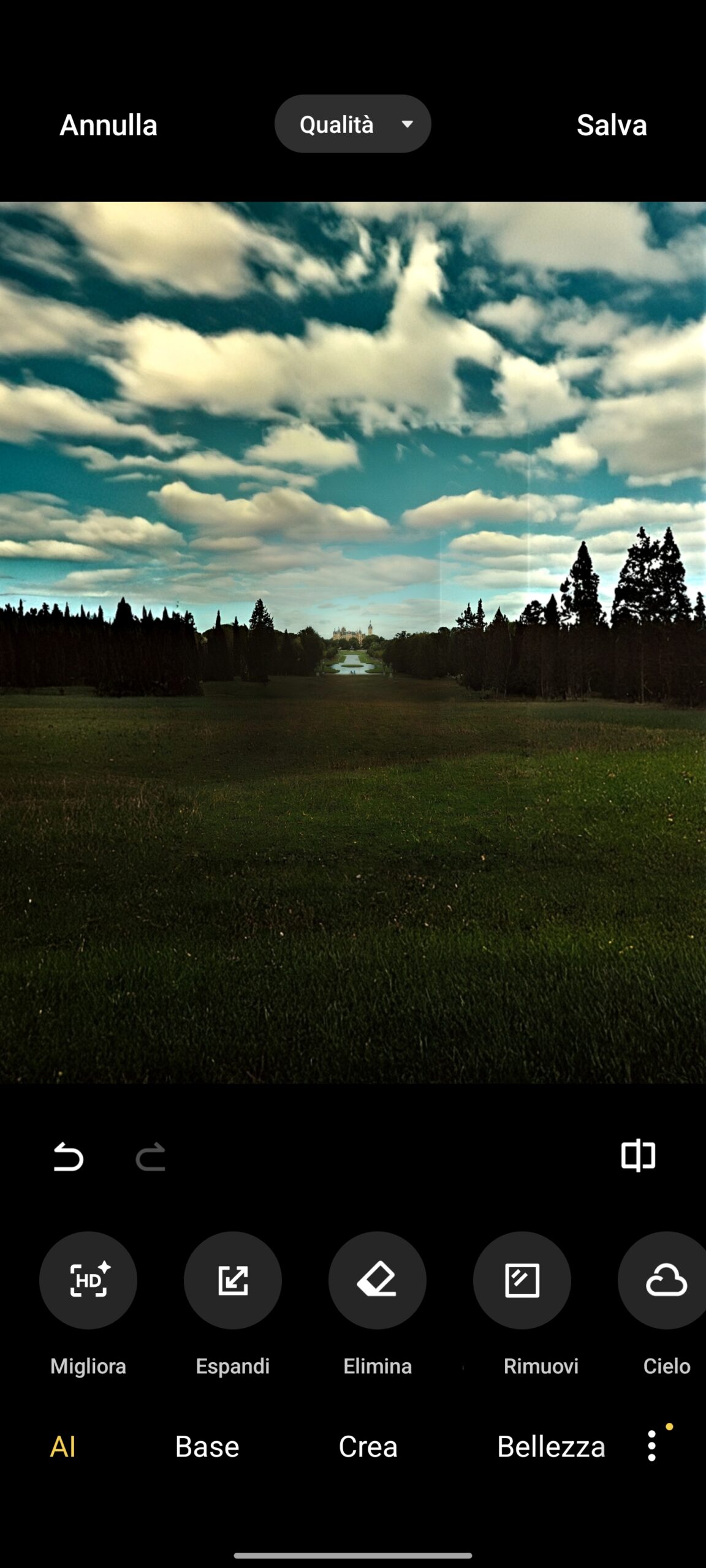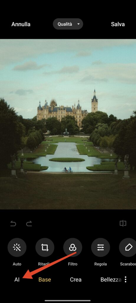 Nel menu AI, troveremo varie funzionalità che faranno tutte utilizzo dell’intelligenza artificiale per modificare le foto, tra cui eliminazione dei riflessi, cancellazione elementi a schermo, modifica del cielo e, per l’appunto, espandi, che è quella che andremo a selezionare.