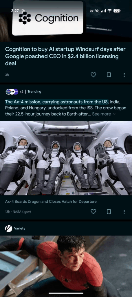 Al posto della classica scheda con il logo di una sola testata, ora in alcuni casi compaiono più icone sovrapposte nell’angolo in alto a sinistra, a indicare che il contenuto è stato creato attingendo a diverse fonti. Toccandole, si apre un pannello con l’elenco completo degli articoli usati per generare il riassunto, offrendo una panoramica più ampia prima ancora di cliccare.