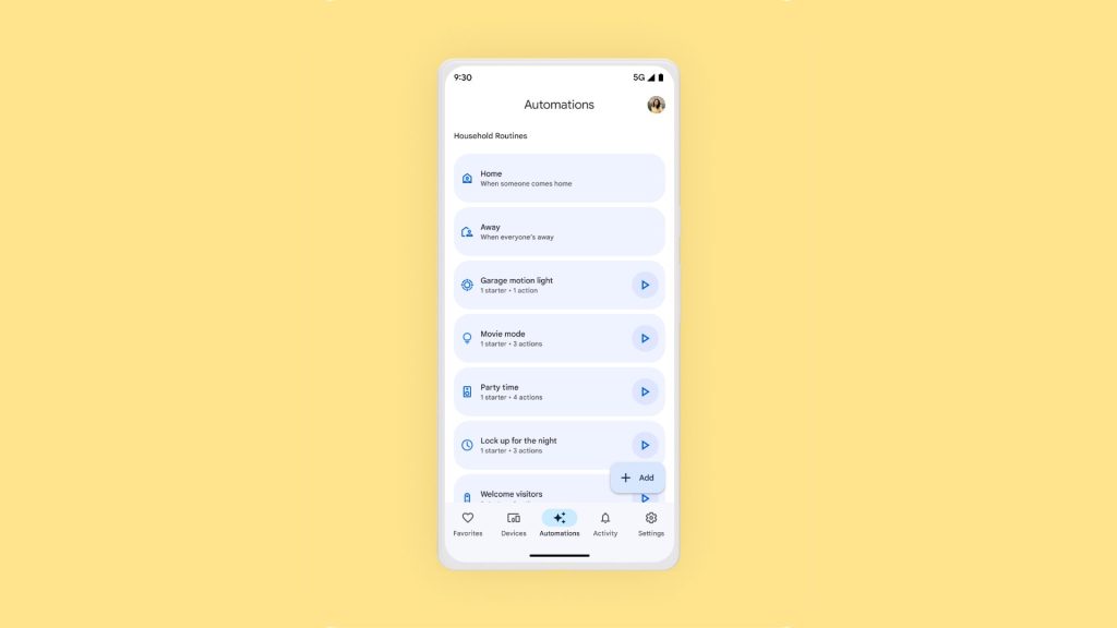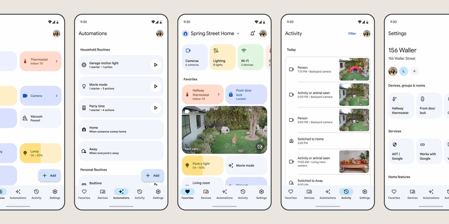 La nuova interfaccia dell’app Google Home presenta cinque sezioni principali nella parte inferiore dello schermo (Preferiti, Dispositivi, Automazione, Attività, Impostazioni), che consentono un controllo più intuitivo rispetto alla precedente versione dell’app. La sezione Preferiti si è rapidamente affermata come la più popolare: consente di aggiungere dispositivi smart home, azioni, controlli multimediali, flussi in diretta da telecamere di sicurezza e molto altro, rendendo tutto facilmente accessibile in un unico posto.