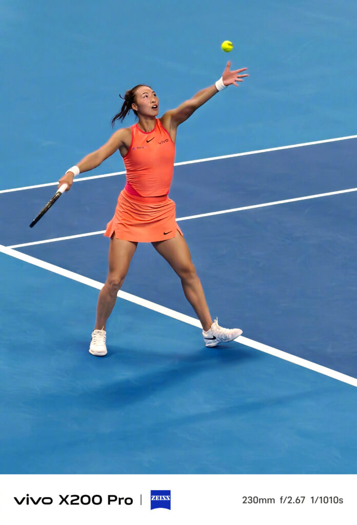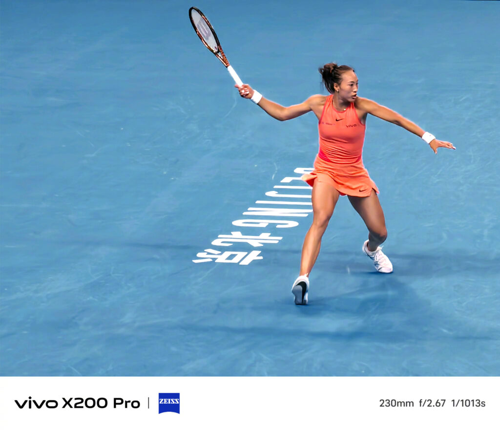 Lo stesso sensore è presente anche nel vivo X100 Pro. Le immagini di esempio, che ritraggono la tennista Zheng Qinwen, sono state scattate con una lunghezza focale di 230mm e un’apertura di f/2.67, catturando l’azione con dettagli nitidi anche a distanza.