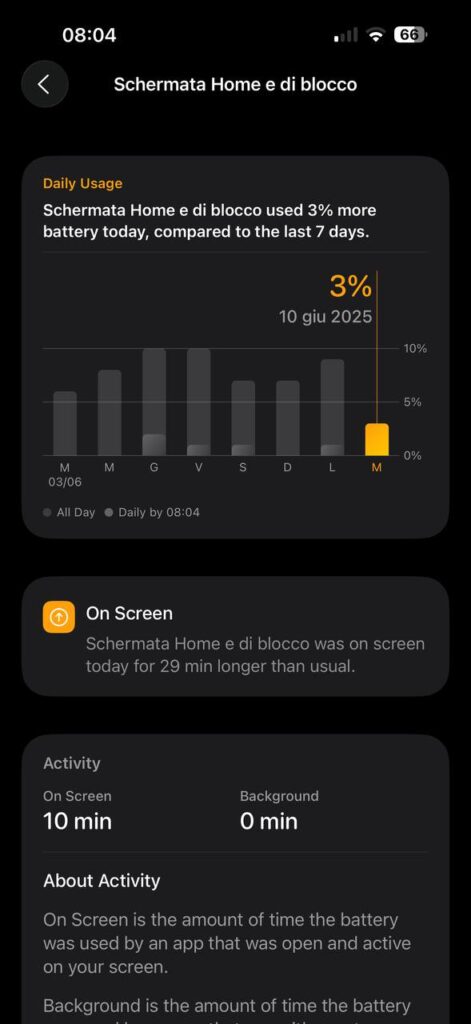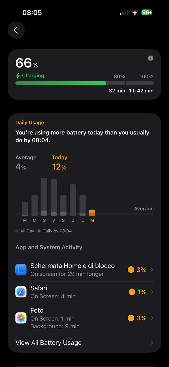 Oltre al grafico settimanale, è possibile sfogliare i sette giorni precedenti per ottenere un’analisi dettagliata dell’uso della batteria, con una distinzione tra utilizzo attivo e tempo in cui lo schermo è rimasto inattivo, oltre a indicare quando e per quanto tempo l’iPhone è stato in carica. Rimane presente anche la sezione Stato Batteria, che mostra cicli di ricarica e capacità massima, insieme alla possibilità di impostare un limite di ricarica all’80%.
