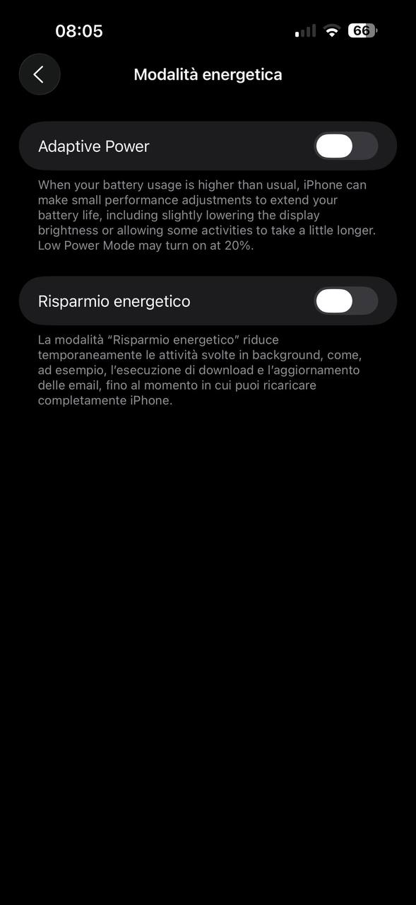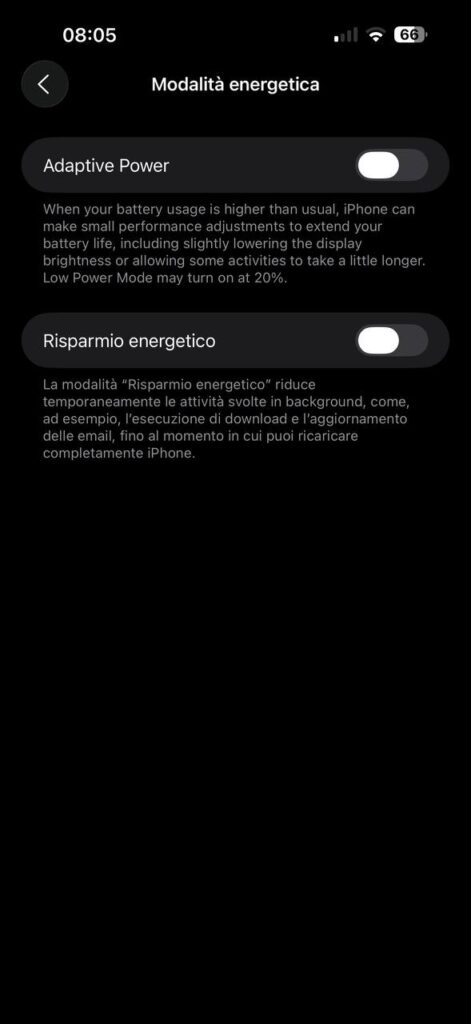 La novità più interessante in termini di gestione energetica è la nuova Modalità Energetica Adattiva, che, a differenza della classica Modalità Risparmio Energetico, si attiva automaticamente quando l’iPhone rileva un uso superiore al solito, e regola elementi come la luminosità dello schermo per ottimizzare l’autonomia senza compromettere troppo le prestazioni.