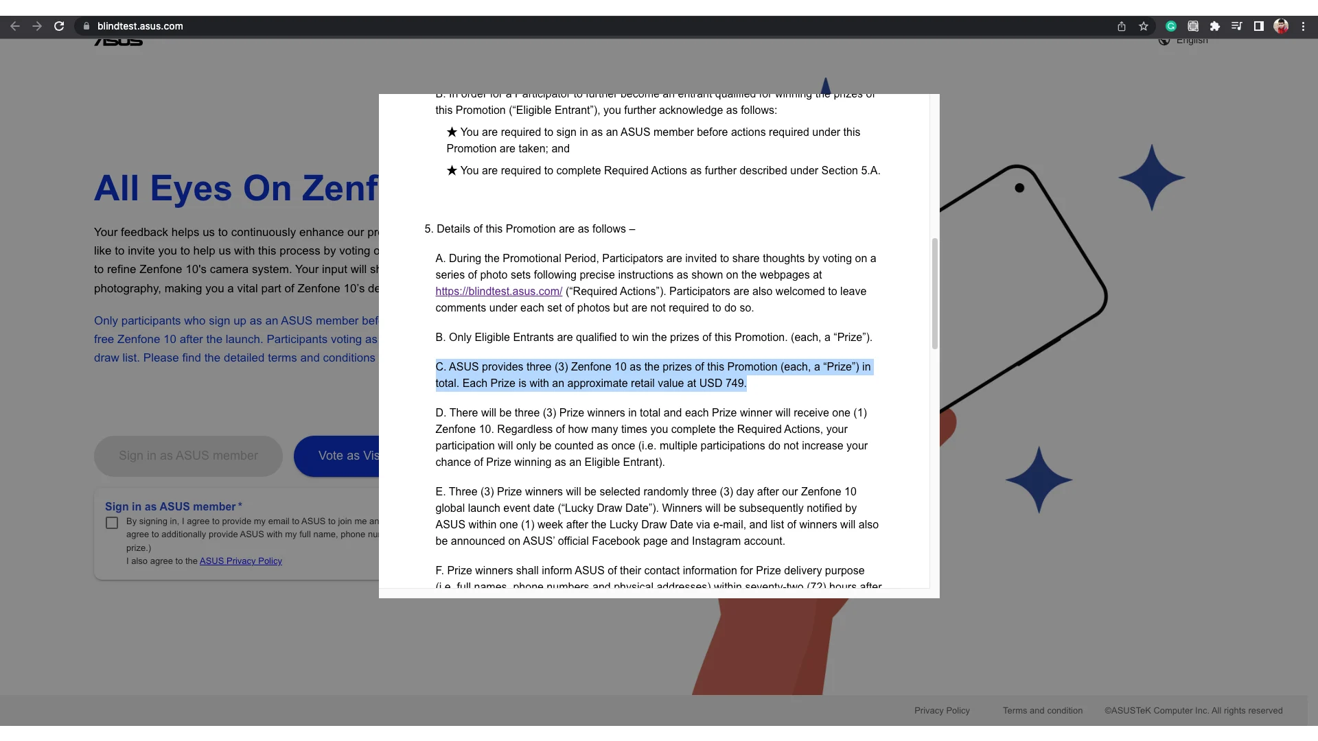 Sul sito di ASUS, infatti, è attivo un contest che invita gli utenti a dare feedback su una serie di foto al fine di migliorare le prestazioni della fotocamera dello Zenfone 10. Tra le condizioni del concorso, si legge: “ASUS offre tre (3) Zenfone 10 come premi di questa promozione in totale. Ogni Premio ha un valore approssimativo al dettaglio di 749 USD”. Questo suggerisce che il prezzo di partenza dello Zenfone 10 negli Stati Uniti sarà di 749 dollari.