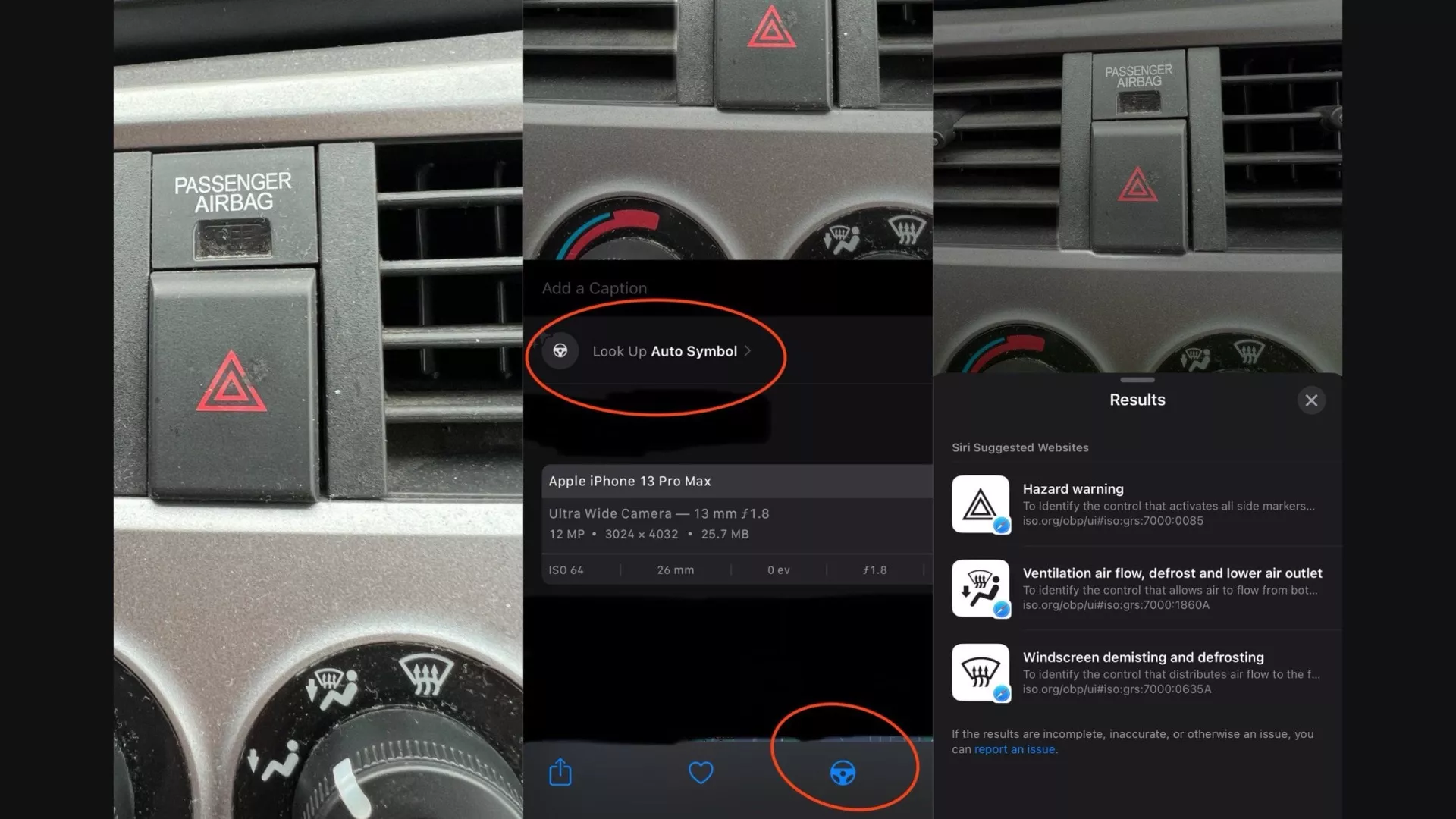 Nell’esempio condiviso dall’utente, un iPhone è riuscito a identificare il pulsante di avvertimento di pericolo nella macchina, così come i pulsanti per lo sbrinamento del parabrezza e la ventilazione. Questa funzionalità potrebbe far risparmiare tempo e sforzi la prossima volta che una nuova spia di avvertimento apparirà sul cruscotto dell’auto, eliminando la necessità di cercare il manuale dell’auto buttato chissà dove.