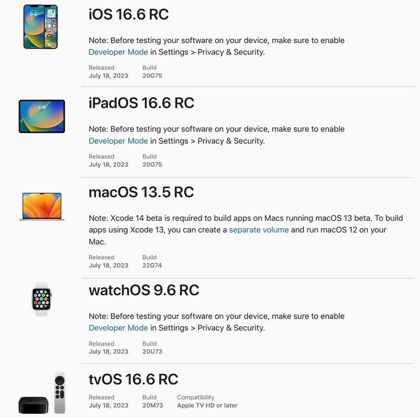Oggi però è stato rilasciata ai developer la Release Candidate per iOS 16.6, il che indica che l’aggiornamento è probabilmente a meno di una settimana di distanza dall’uscita ufficiale. Le Release Candidate danno ai beta tester l’opportunità di provare la versione finale di un aggiornamento prima che venga rilasciato al pubblico. Nel frattempo, Apple continua a dividere le sue risorse tra le rimanenti versioni di iOS 16 e la beta di iOS 17, la cui release stabile è prevista per settembre. Inoltre, sono stati rilasciati i Release Candidate per watchOS 9.6, macOS Ventura 13.5, e tvOS 16.6, tutti con note di rilascio che indicano la correzione di bug minori trovati nei vari sistemi operativi.