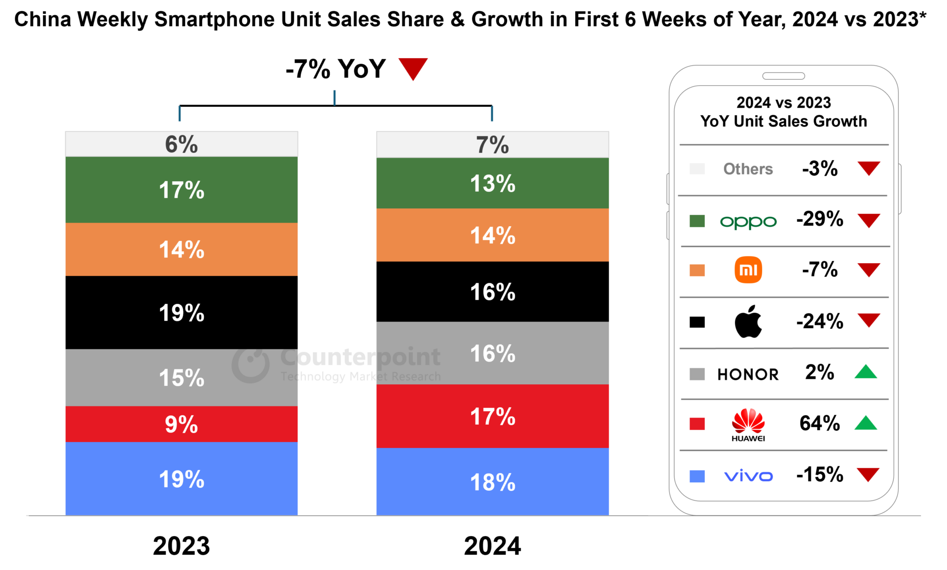 Secondo Counterpoint Research, le vendite di iPhone sono diminuite del 24%, con Vivo che ha conquistato la vetta grazie al suo successo nel segmento di mercato economico, nonostante una generale contrazione del 7% del mercato cinese a causa di una deflazione nazionale. Parallelamente, Huawei ha incrementato la sua quota di mercato dal 9,4% al 16,5%, merito della popolarità della sua serie Mate 60, mentre Apple ha visto scendere la propria dal 19% al 15,7%.