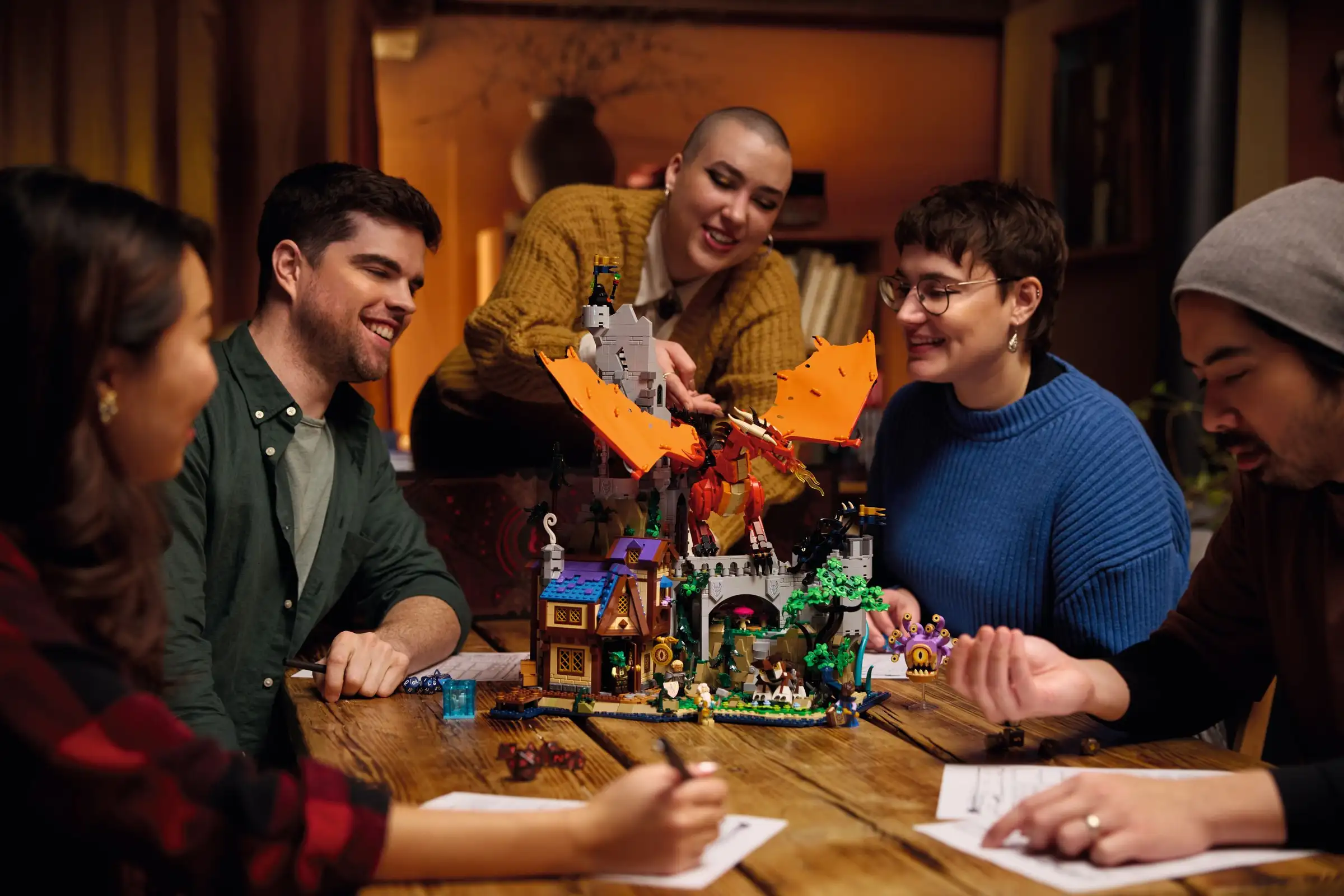Formato da ben 3745 pezzi, il set include una taverna, una prigione e una torre, insieme a un gruppo di minifigure che rappresentano un classico party di avventurieri e una serie di mostri iconici di D&D, incluso ovviamente un possente Drago Rosso.